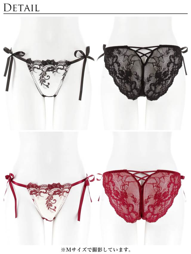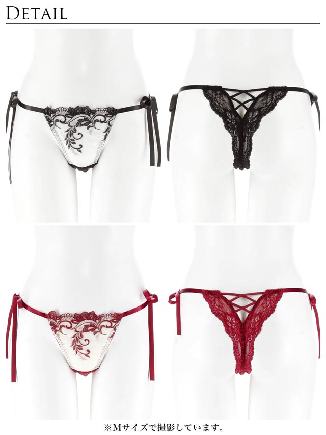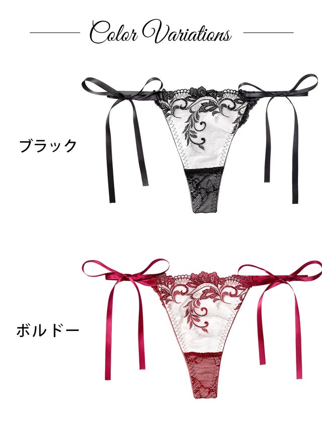 Tバック/クロッチ当て布:有/股上:普通/伸縮性:有/フロント透けなし/脇紐リボン(リアルに解ける仕様)