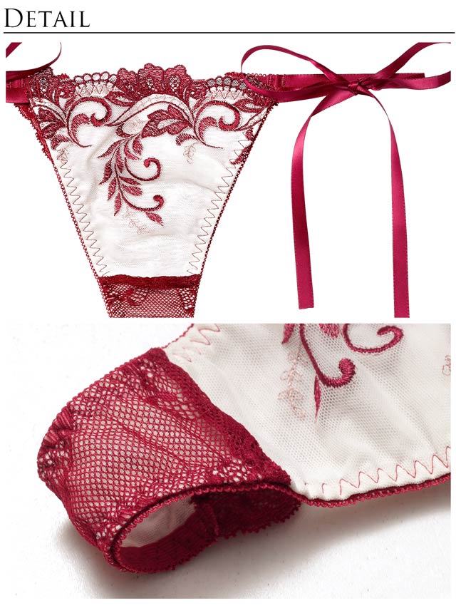 クラシカルなリーフ刺繍が美しく浮かび上がる、上品で印象的なランジェリー。サイドは思わず解きたくなる手結びのリボン仕様。艶めくサテンリボンがセクシーさの中にほんのり甘さを感じさせます。