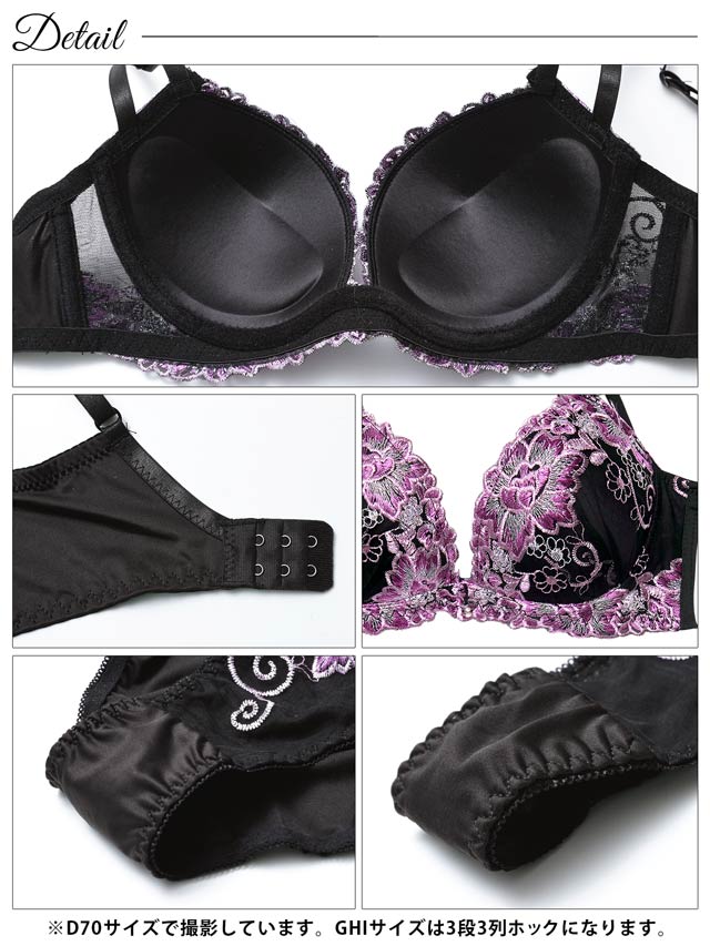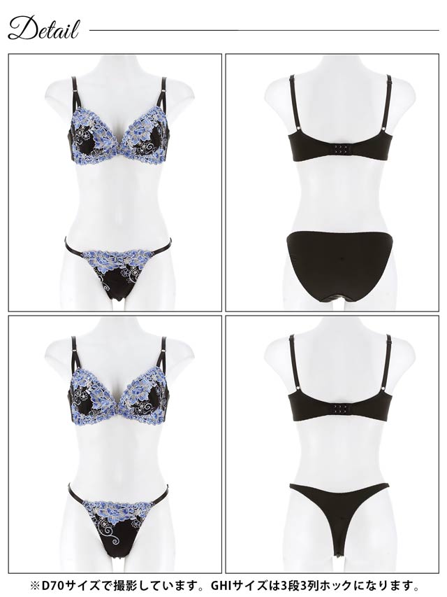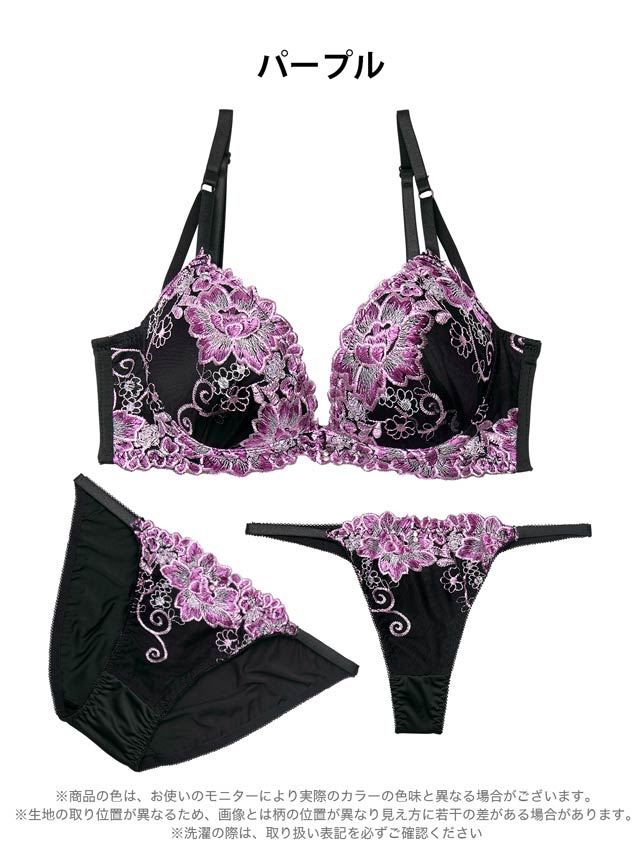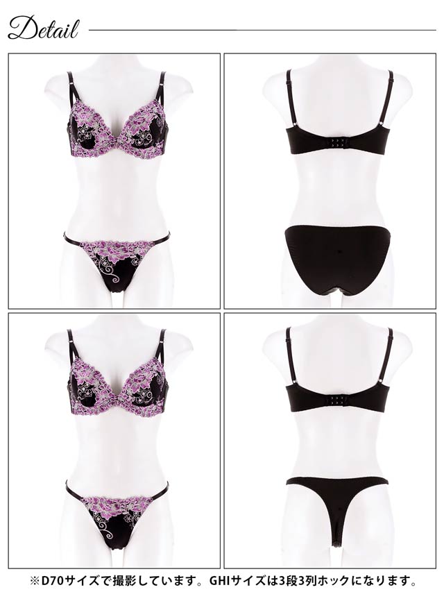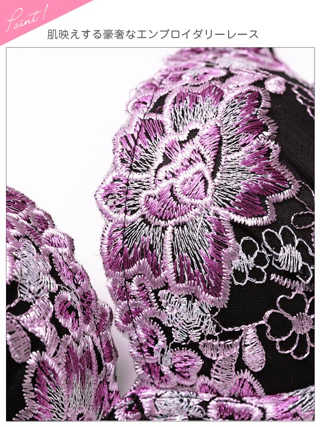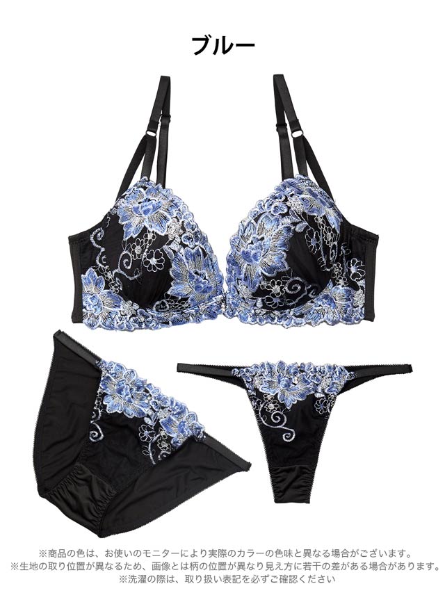 ブラックベースに美しく映える色鮮やかなフラワー刺繍がラグジュアリームード漂うランジェリー。三角ストラップ×脇高設計でバストをしっかりと寄せて、谷間&美シルエットをキープ!フルバック・Tバックのサイドはストリング仕様で腰回りを色っぽく見せてくれます♪