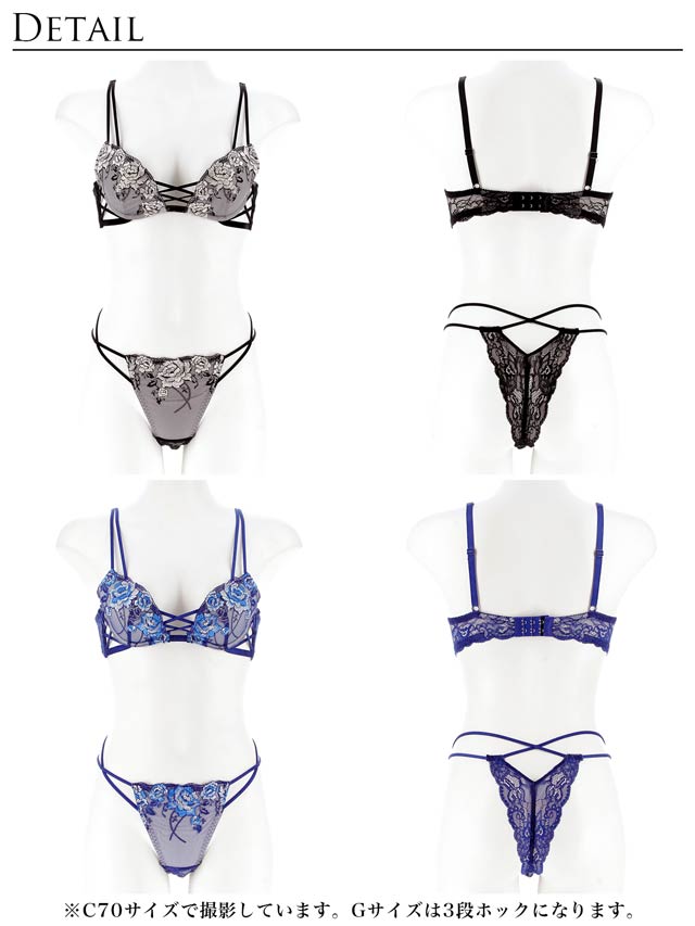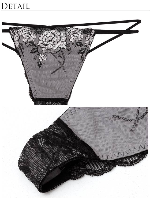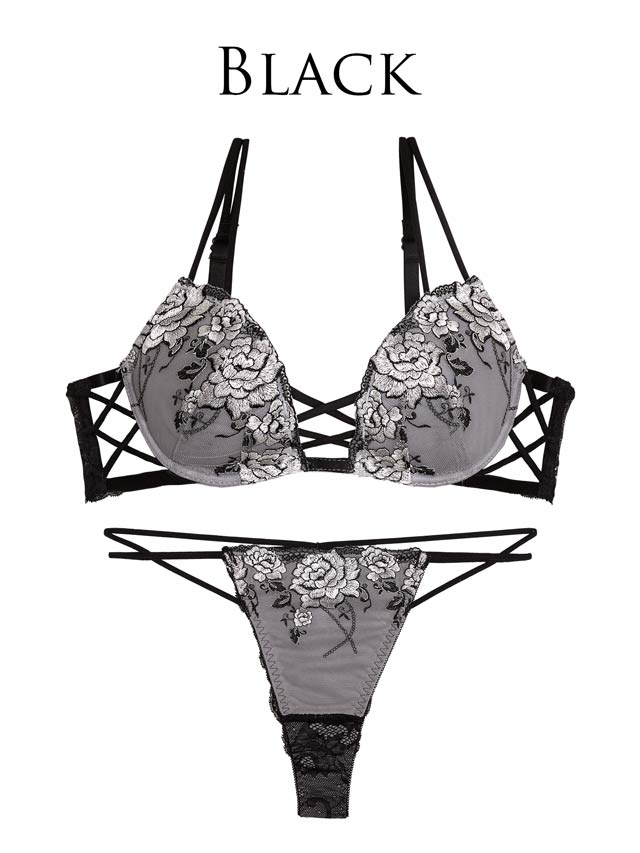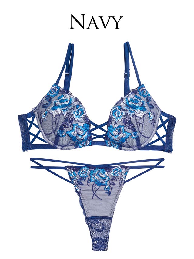 満開のフラワー刺繍が華やかでラグジュアリーなムードを演出するランジェリー。大胆にカットされた谷間とカップ脇にはクロスコードをあしらい、より一層セクシーな印象に。ショーツのサイドも華奢なコードデザインで、色っぽく女性らしいボディラインを引き立てます。