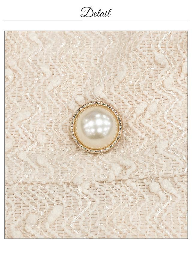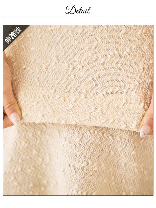 キラリと輝くラメ生地に波打つような曲線を描いた織柄が上品なミニドレス。中央にあしらわれた大粒のパールボタンビジューが高級感のあるアクセントに◎ 程よく肌魅せ出来る大人レディな雰囲気漂う1着です。