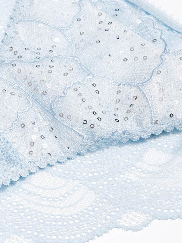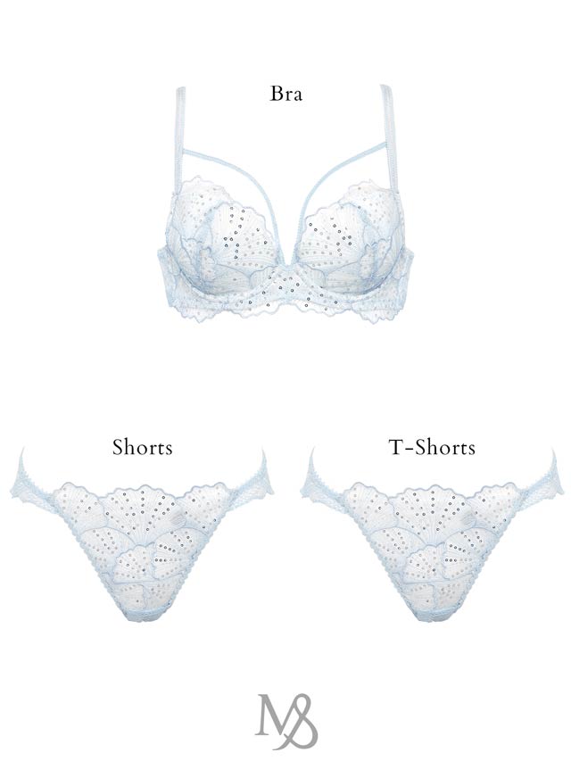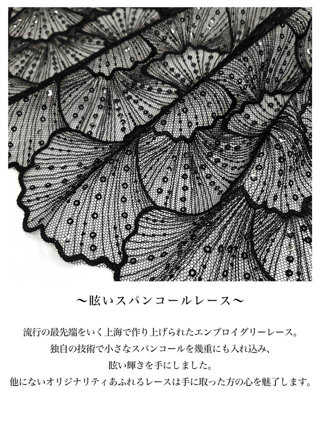 眩いスパンコールをちりばめた上海エンブレースをふんだんに使用したランジェリー。シェルを思わせるエンブレースは、まるで恋焦がれる人魚姫のように美しく、繊細。さらにエンブレース下にはラメチュールを入れることで、一層輝きを放ち、女性の魅力を最大限に引き立ててくれます。