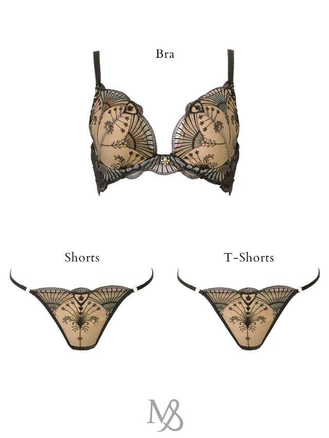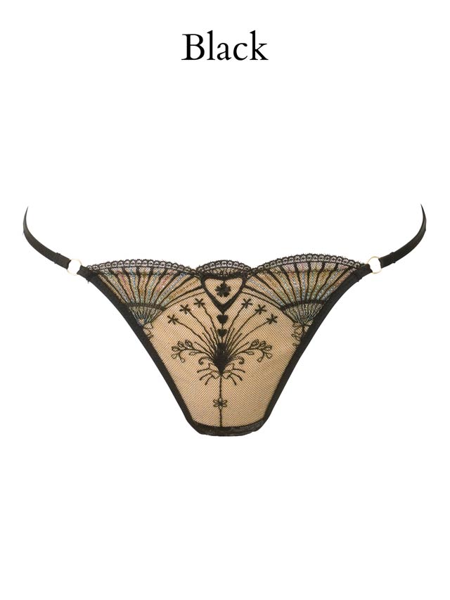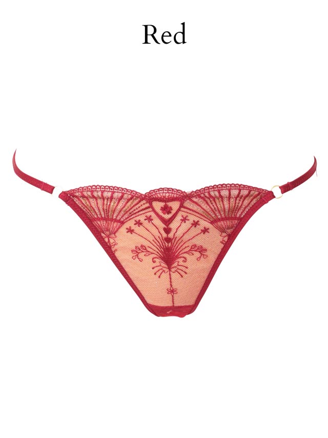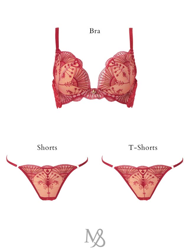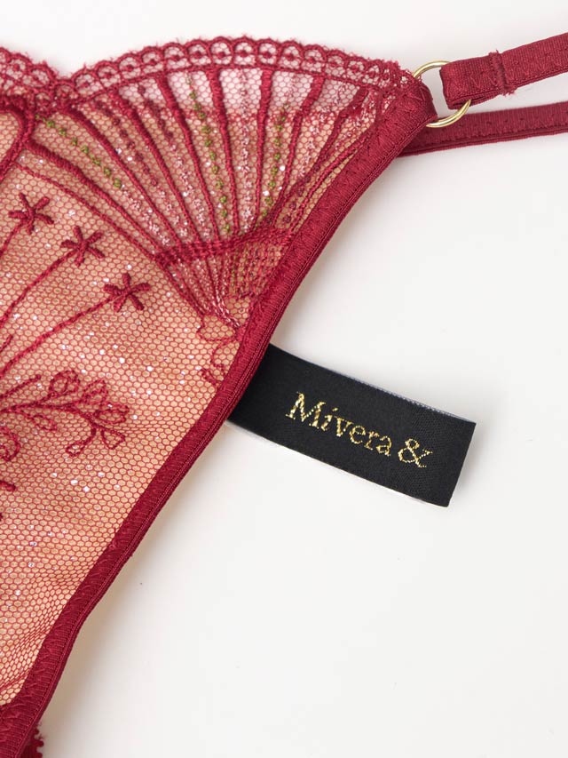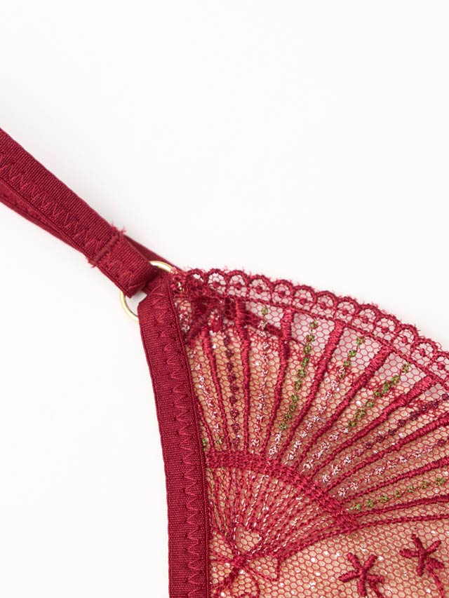 女王の扇をイメージした上海エンブレースがインパクトを放つランジェリー。優美なエンブレースは、マルチカラーのラメ糸を使用しているので、角度によってさまざまな表情を魅せます。さらにエンブレース下にはラメチュールを入れることで、一層輝きを放ち、まるで扇を仰ぐたびに誘惑してくるよう。光沢感が美しい二浴レースを背中に使用。脇はコードで華奢に仕上げ、品のあるセクシーさに。 まるで地肌にレースをまとっているような妖艶なブラック、レッドは女王の気品を感じさせます。 大人の女性に贈るランジェリーです。