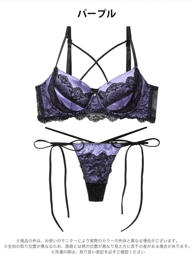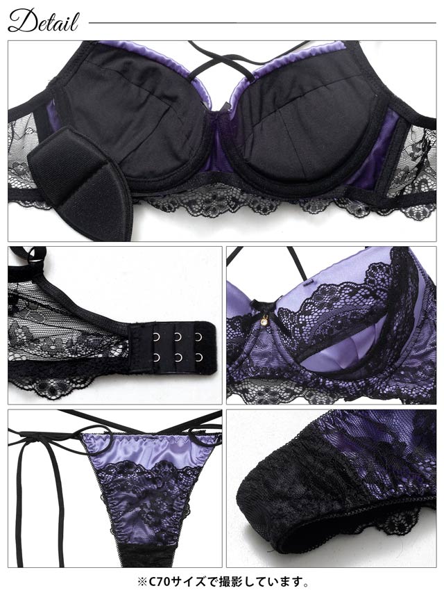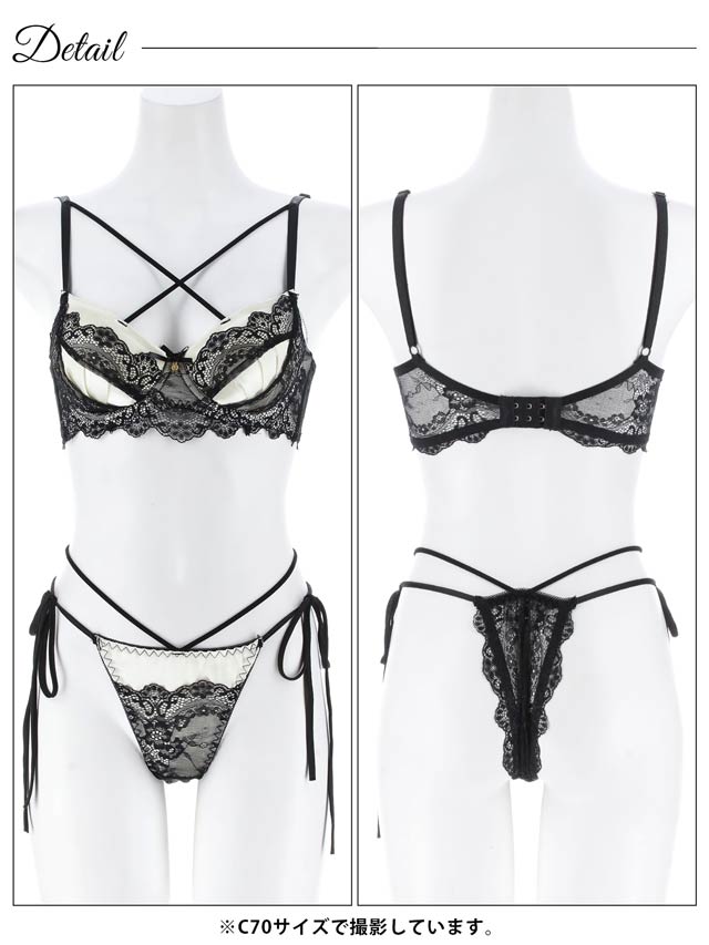 滑らかなサテン地にセクシーさ引き立つブラックレースの透け感が印象的なランジェリー。デコルテや腰回りにあしらわれた華奢なストリングデザインが女性らしい妖艶さを演出します。リアルに解ける紐パンツが刺繍的な夜にもぴったりな1着です。