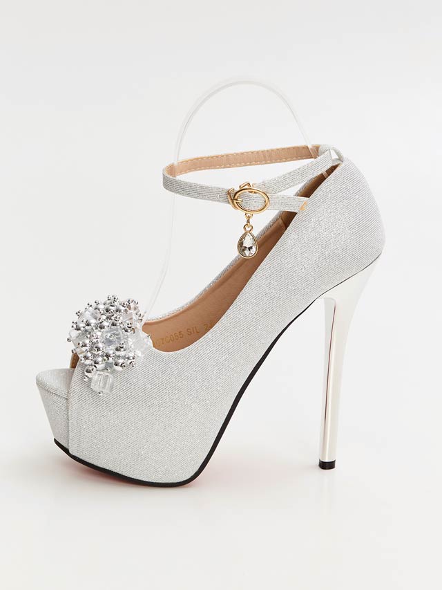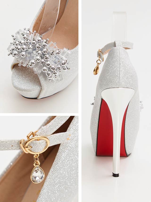 煌びやかなボールチェーンとクリアビジューを合わせた華やかなオープントゥパンプス。上品なラメ生地が歩く度足元から高級感を与えてくれます◎ 足首をしっかりホールドしてくれるアンクルストラップと高ストームで安定感も兼ね備えたアイテムです。