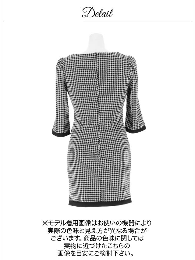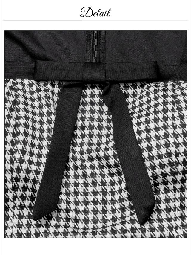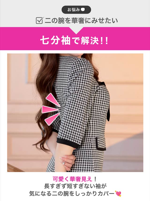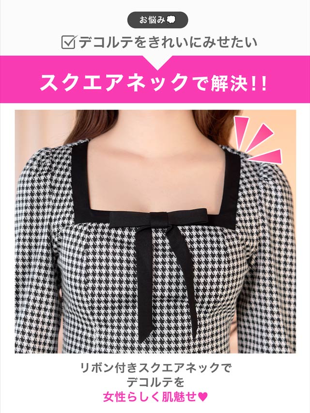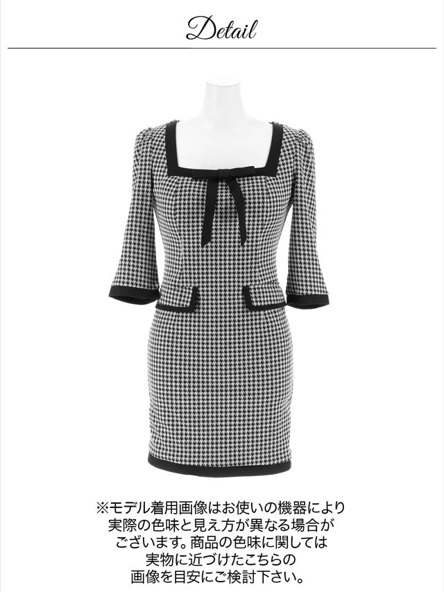 クラシカルな千鳥格子柄と胸元にあしらわれたリボン装飾が可愛らしいミニドレス。デコルテやお顔周りをスッキリ魅せてくれるスクエアネックも魅力的です◎ 腕周りの体型カバーにもなる七分袖が大人な女性らしい1着です。