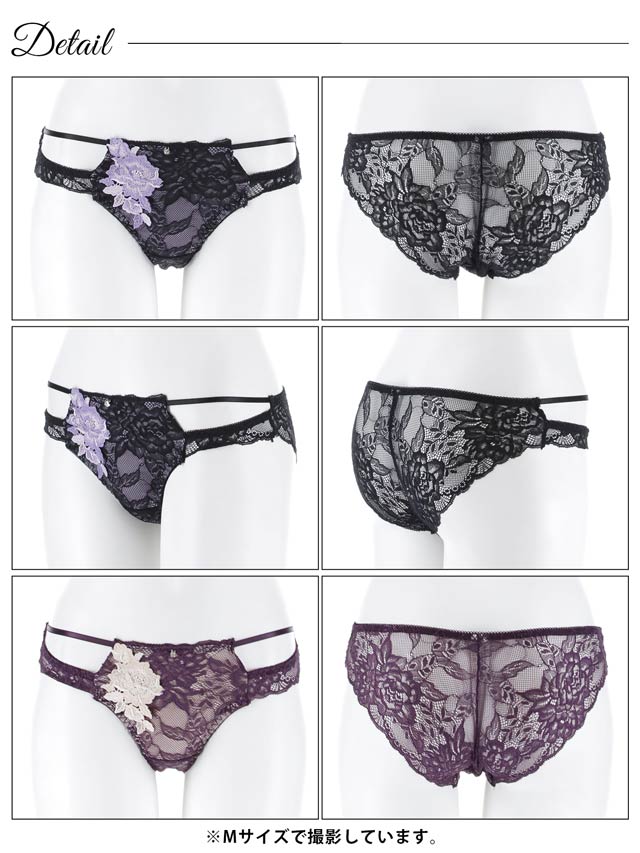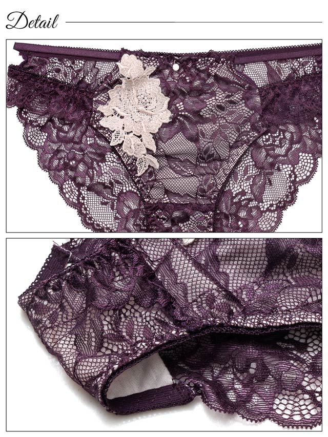 深みのあるカラーのレースに美しいローズモチーフを飾ったラグジュアリームード漂うランジェリー。サイドのストリングデザインがセクシーなアクセントに♪バック透け仕様で後ろ姿まで色っぽく。やわらかな肌あたりのレースでアウターにひびきにくく履き心地も快適です◎