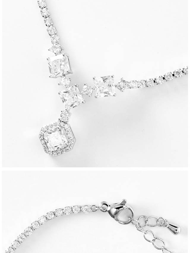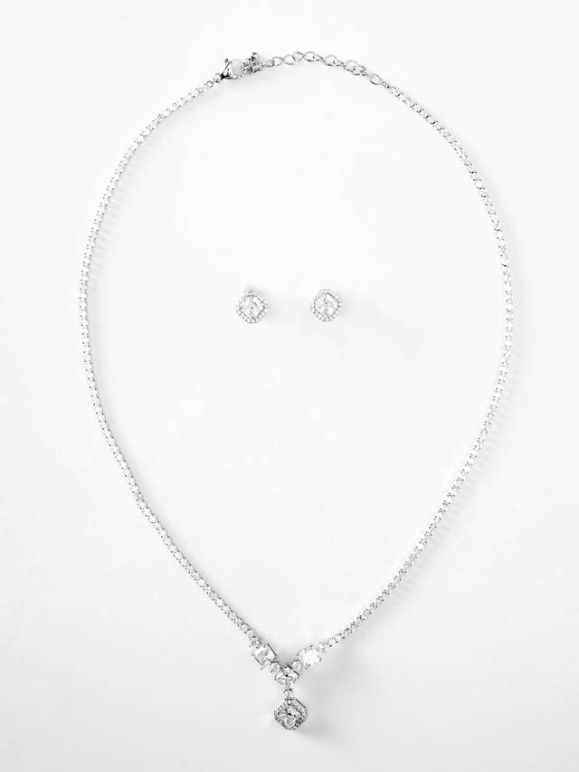 繊細なラインストーンを贅沢に連ねた、上品さ漂うネックレス&ピアスセット。中心にきらめくスクエアカットのストーンがほどよい存在感をプラスします。キャバドレスにはもちろん、パーティーや結婚式などフォーマルなシーンにも活躍するアイテムです◎