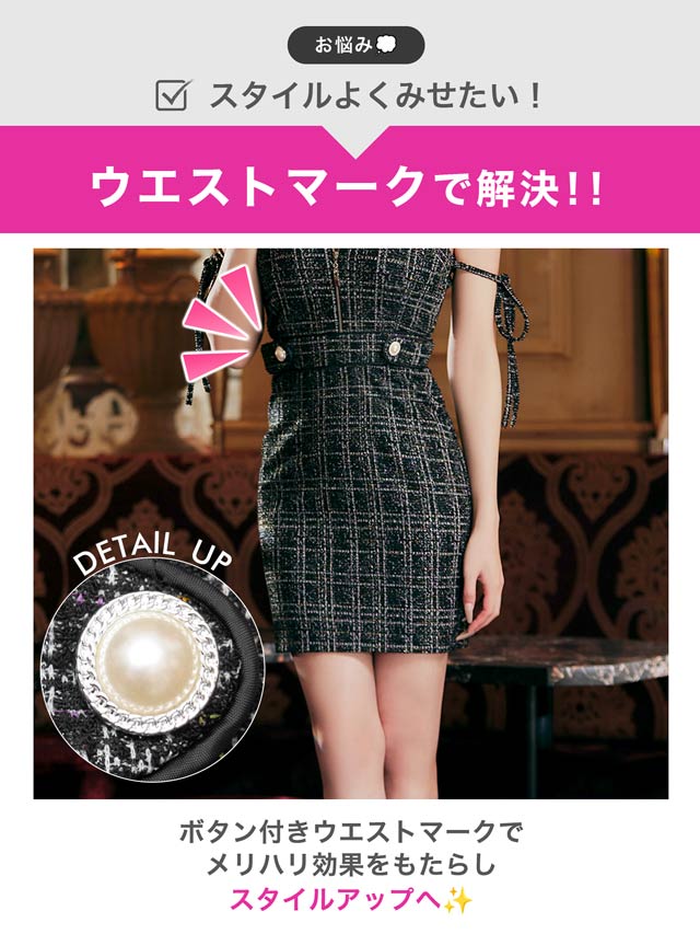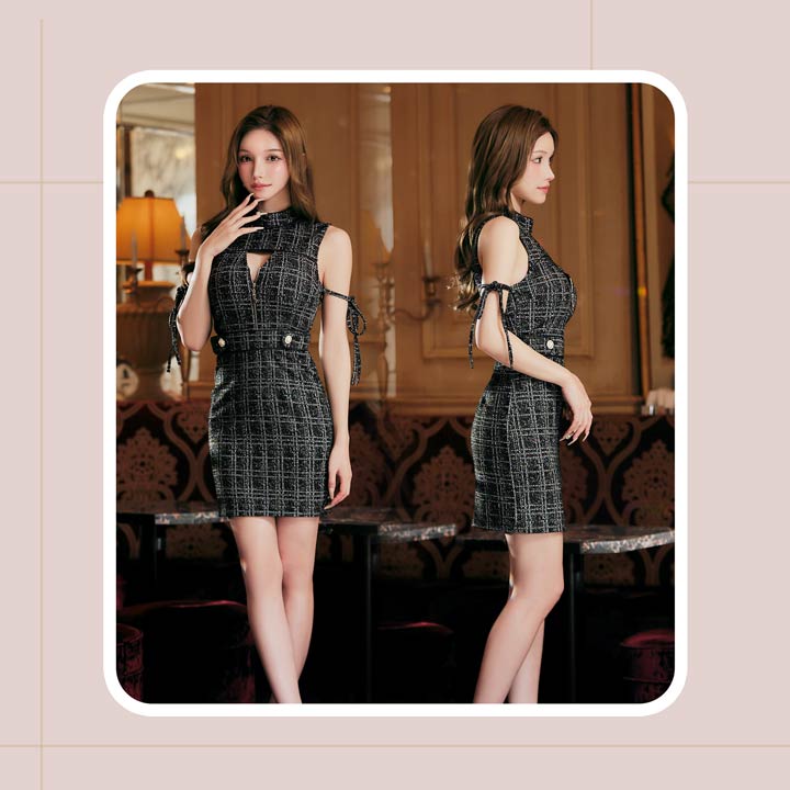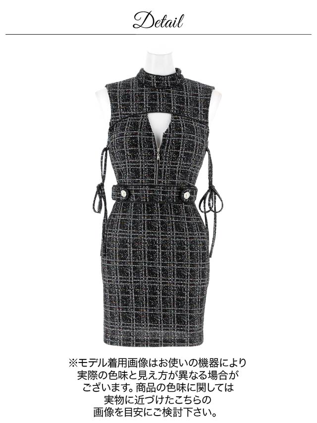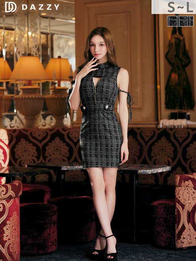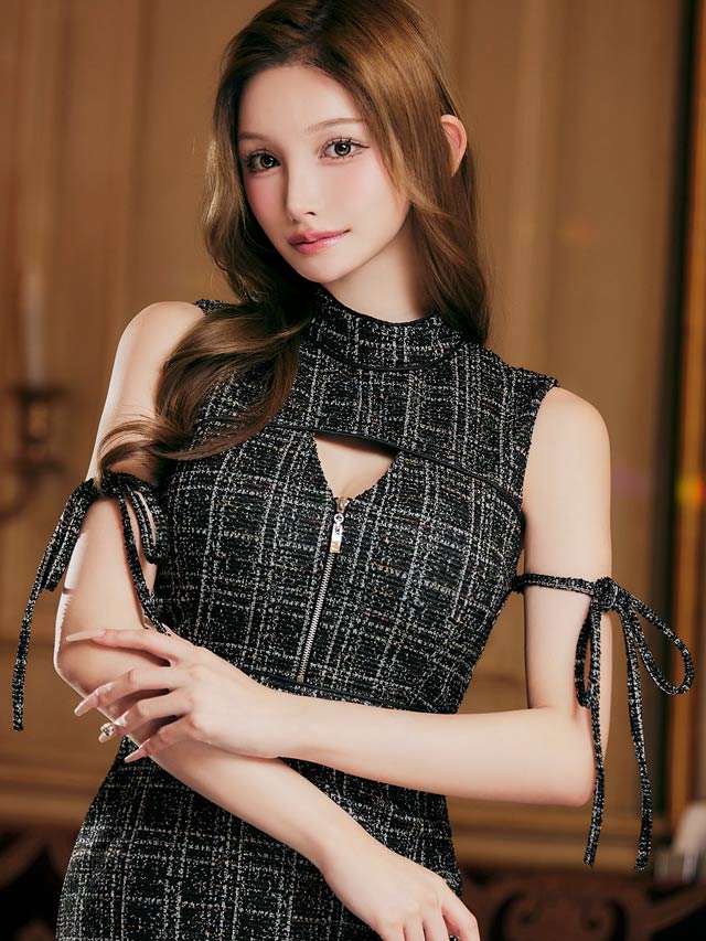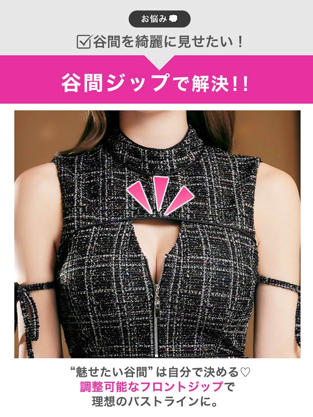 腕周りの紐リボンがキュートなアクセントになったミニドレス。人気のフロントジップ×ホールデザインが谷間に視線を集めてくれるワンポイント◎ ウエストをしっかりマークしてくれるスタイルアップ効果もばっちりな1着です。
