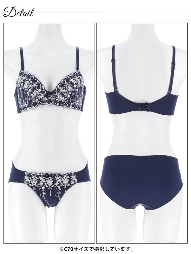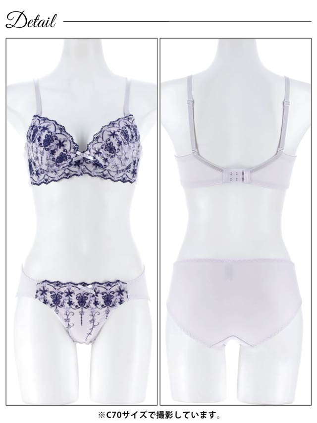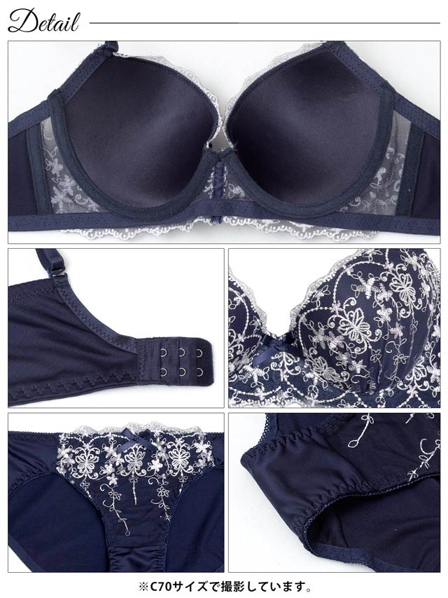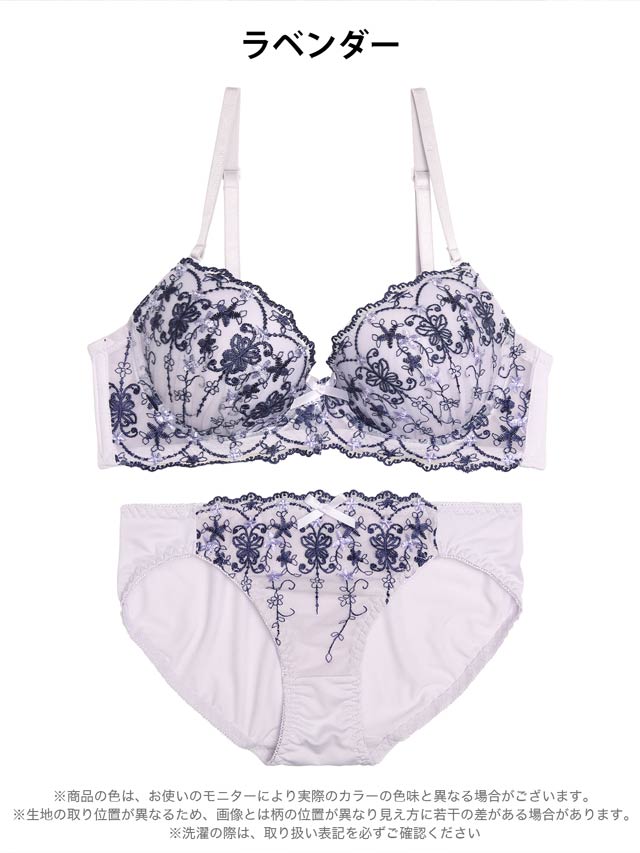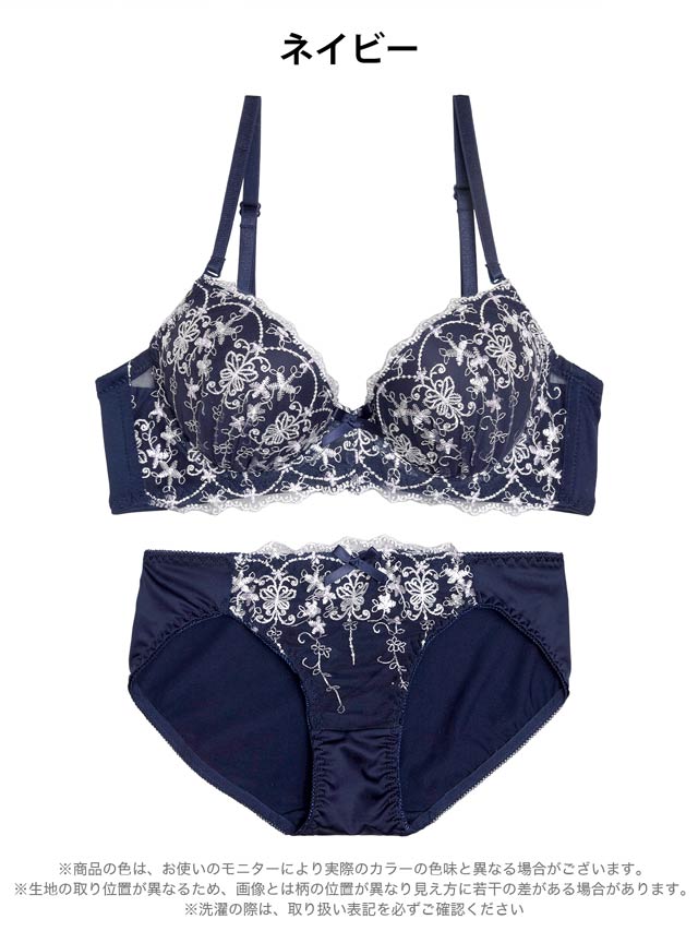 小さな蝶々を散りばめた繊細な刺繍が、大人可愛い雰囲気を演出するランジェリー。フロントにはリボンを添えてさりげなく甘さをプラスしました◎脇や背中のお肉までしっかりと寄せ込む脇高設計で、谷間&美シルエットをキープしてくれる1着です!