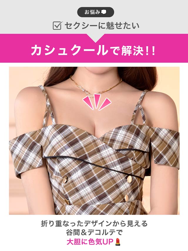 レトロガーリーなチェック柄がキュートなミニドレス。谷間を際立たせてくれるカシュクールの胸元や大胆なオフショルスタイルで色っぽさも欠かしません◎ チラッと見える太もものスリットもワンポイントになった1着です。