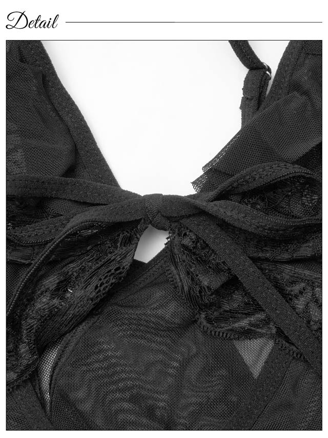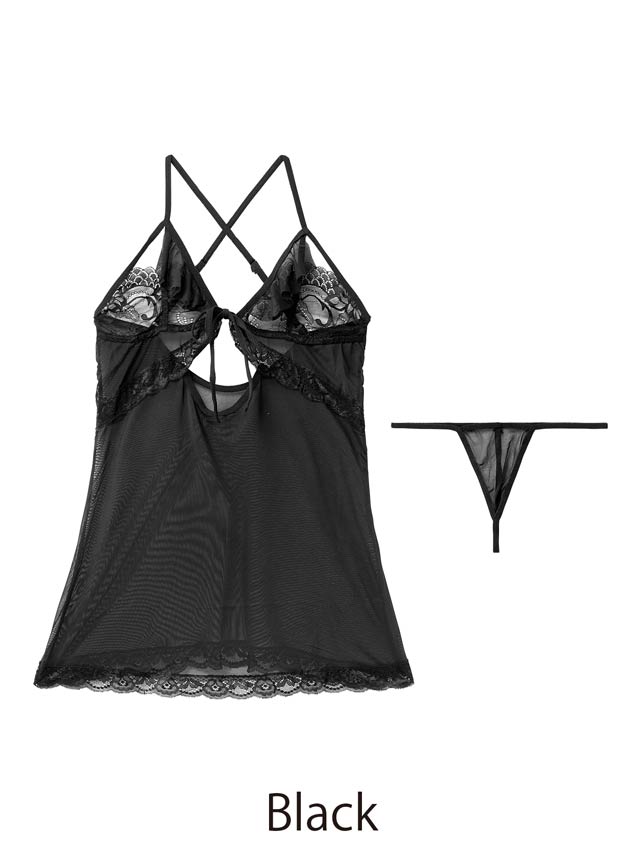 透け感あるヌーディーなベビードール。空いた胸元がセクシーなデザインです♪サイドがストリングラインのショーツも付いてきます◎胸元や裾にレースがたくさん使われていて小悪魔っぽい一着です。