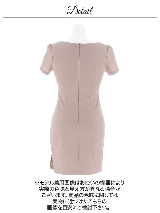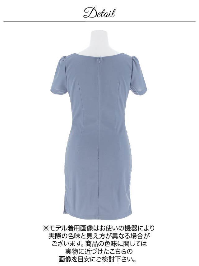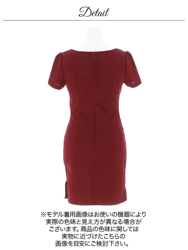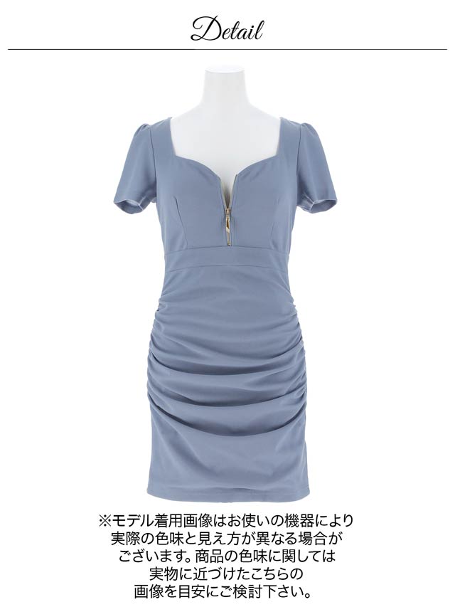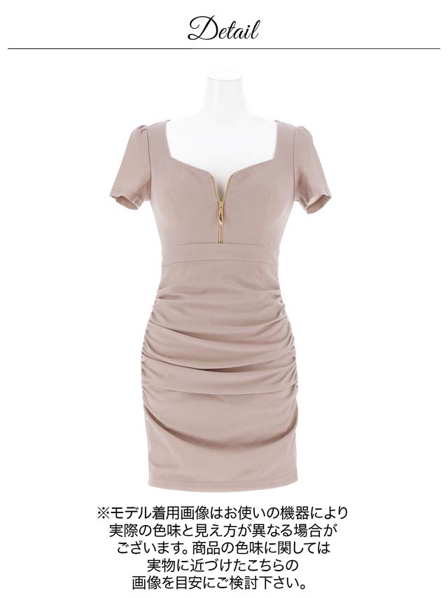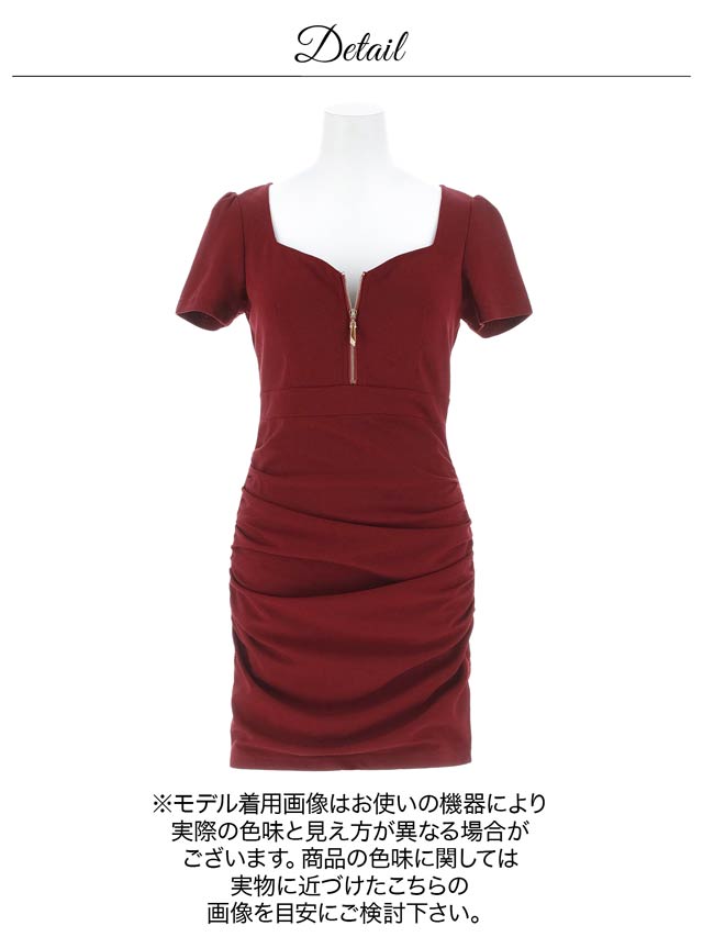 シンプルなワンカラーにフロントジップの谷間魅せが視線を注ぐミニドレス。両サイドにギャザーを寄せたタイトシルエットはボディラインを拾いすぎず、女性らしい滑らかな曲線を演出します◎ スリット部分からチラリと覗く脚が色っぽい!色気とスタイルカバーを兼ね備えた神コスパドレス。