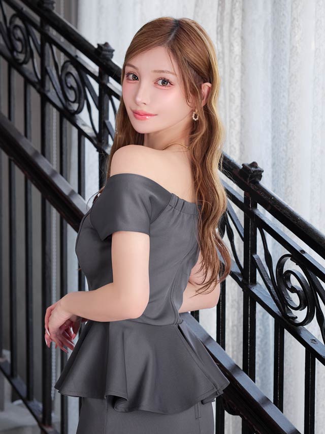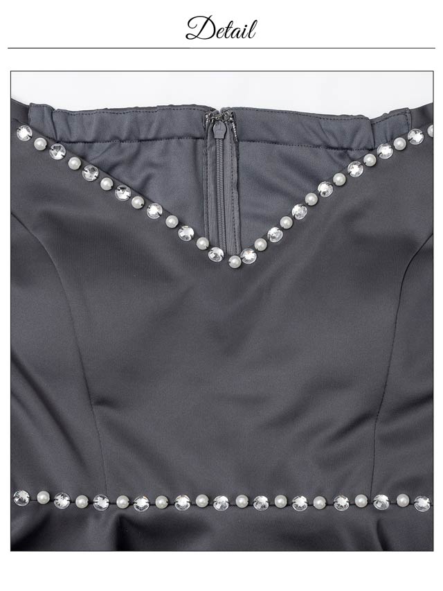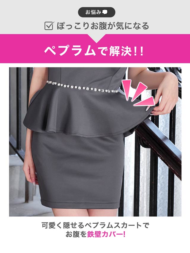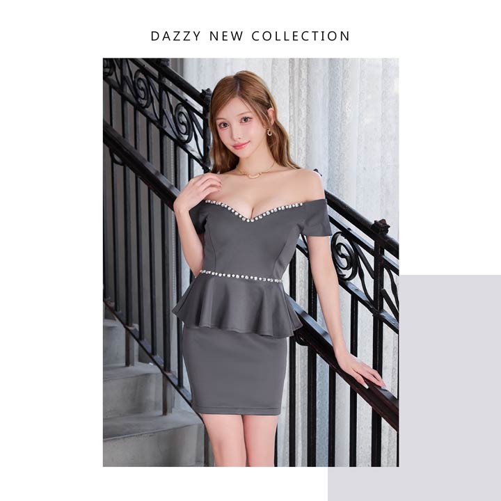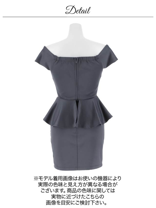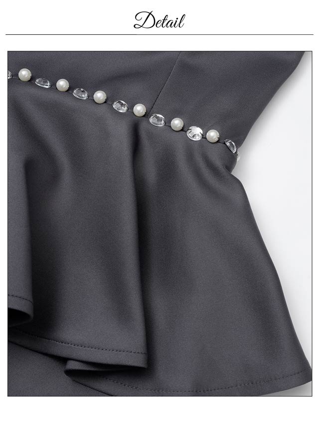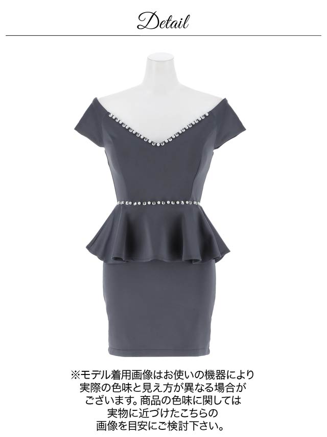 デコルテとウエストにあしらわれた煌びやかなラインストーンが高見え効果を与えてくれるミニドレス。お腹の体型カバーをしつつ、くびれを際立たせるペプラムデザインが美シルエットな1着◎ オフショル仕様が上品で大人っぽい色気を演出します◎