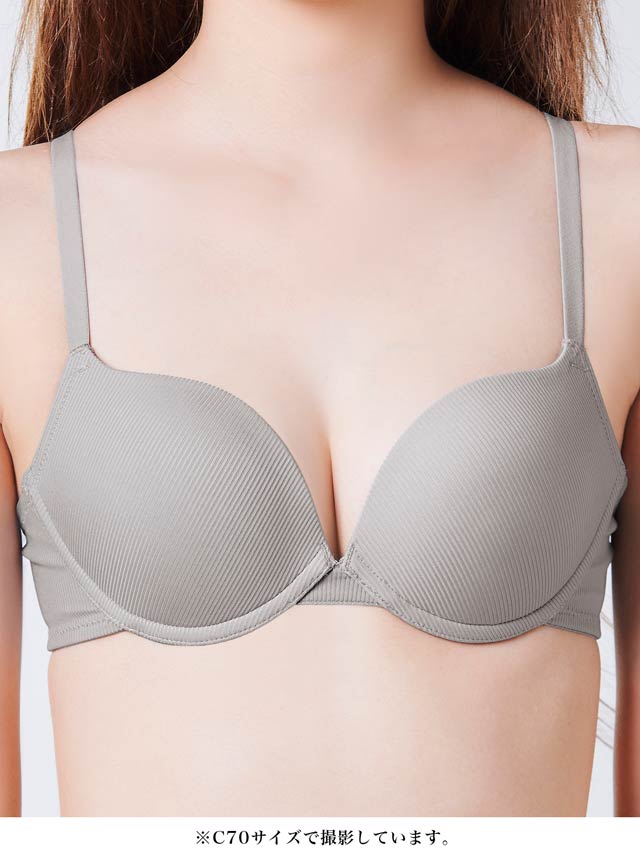 リブ生地を全体に使用したスタイリッシュランジェリー。(表に響かないTシャツブラ)カップ脇から中心に向かってのラインがスタイリッシュで華奢見えするのがポイント。 アンダーフリーパターンで中心の土台細くしたことで華奢さを強調させています。 日常使いに重視し、背中はU字バックで2段ホックシルエットにしています。安定の着心地がポイント!