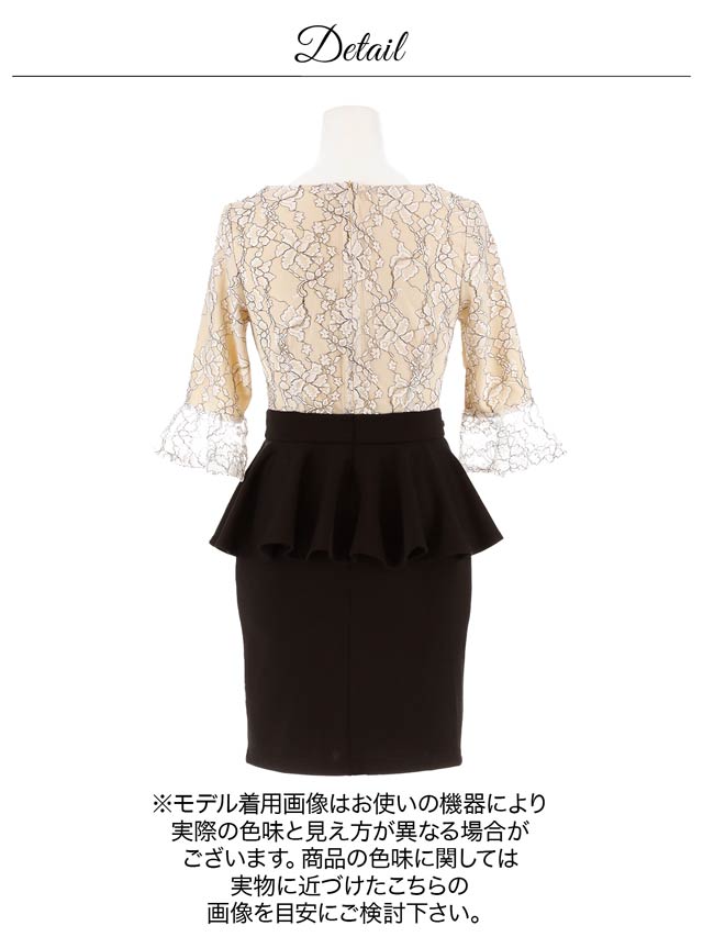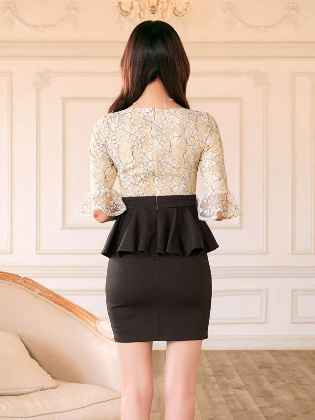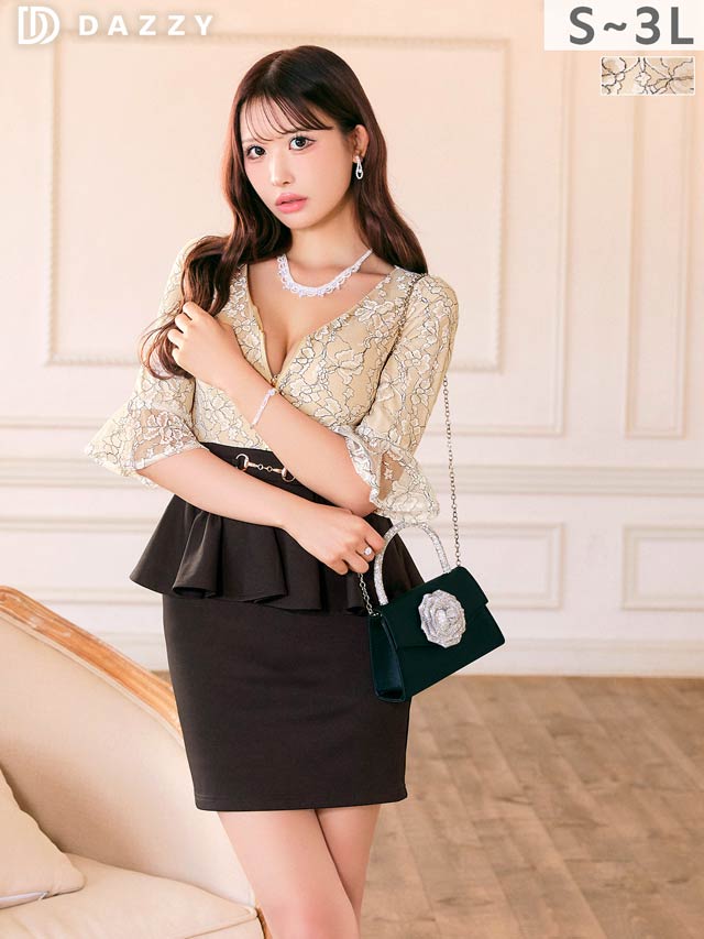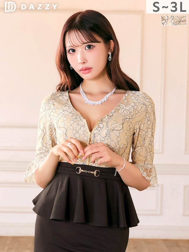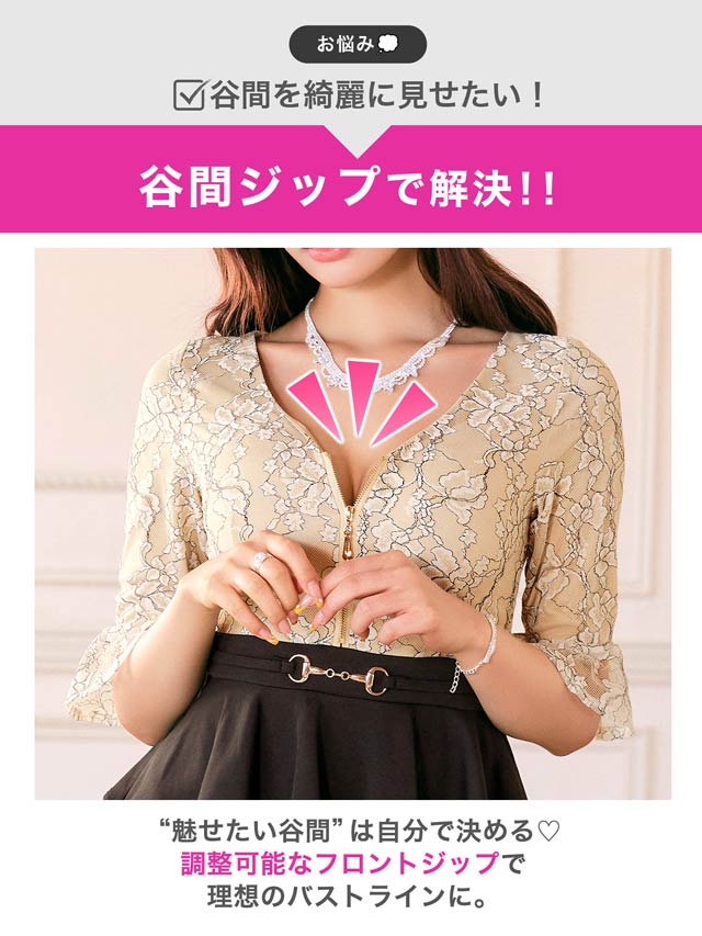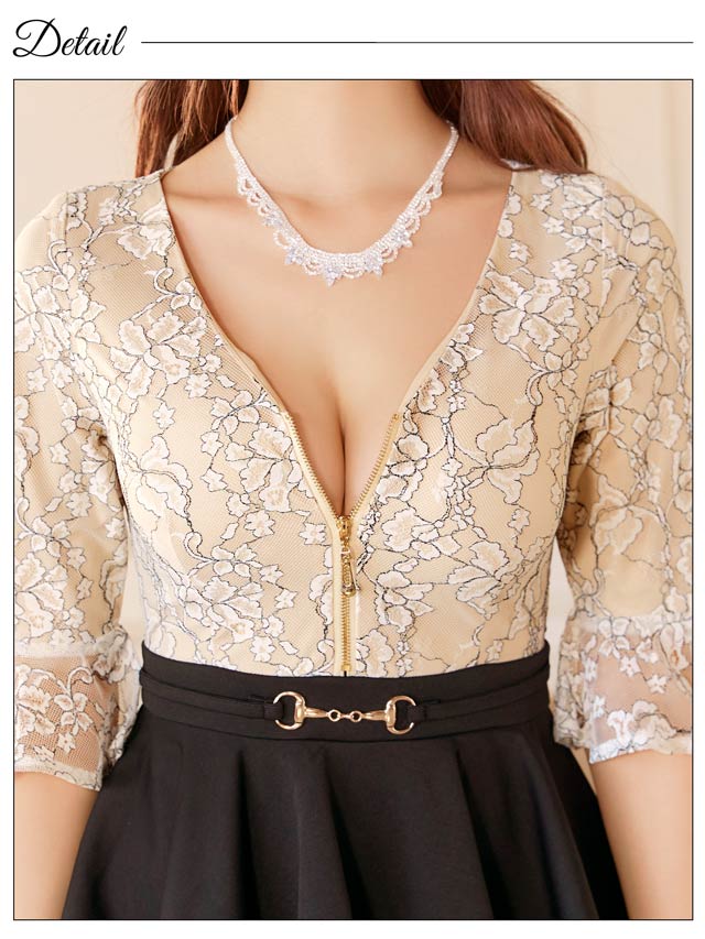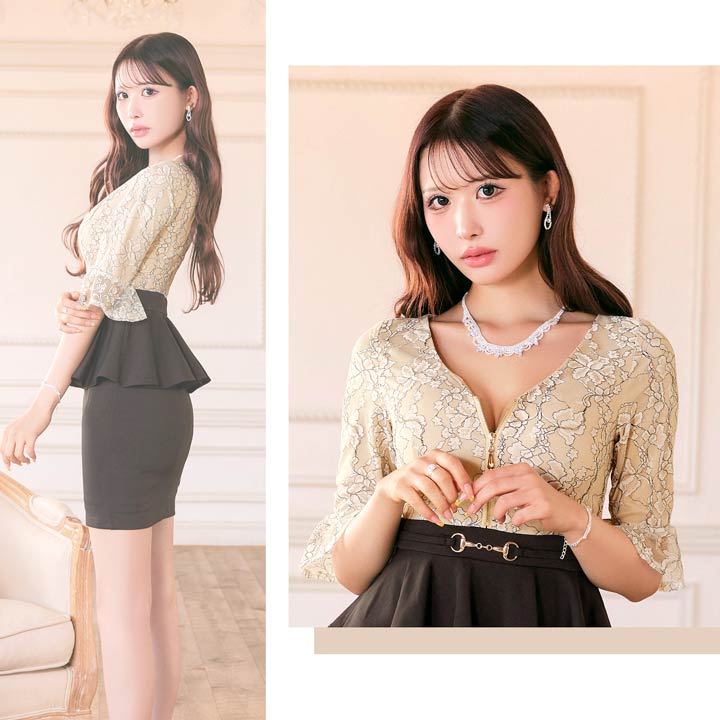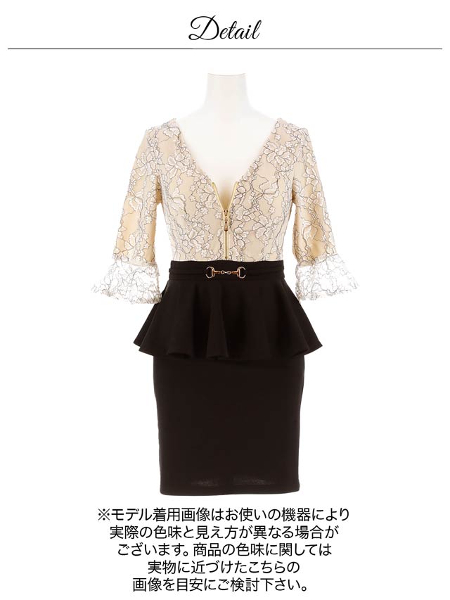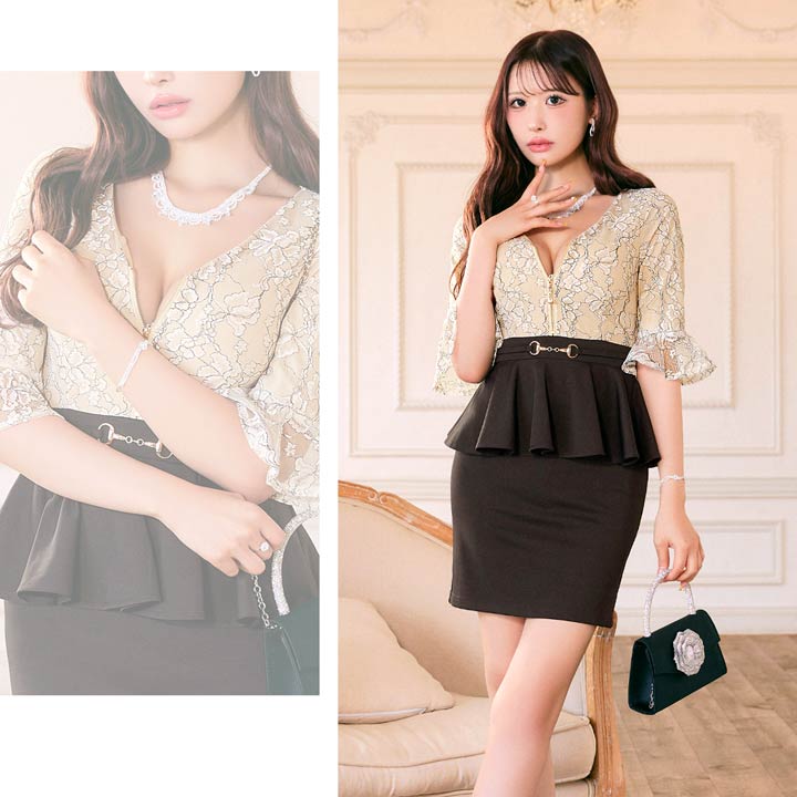 デコルテを美しく演出するVネックにフロントジップの谷間魅せがセクシーさ溢れるミニドレス。繊細なフラワーレースとペプラムスカートで女性らしいシルエットを際立たせます◎ 透け感のある五分袖は二の腕周りをカバーしてくれるのも嬉しいポイントです。