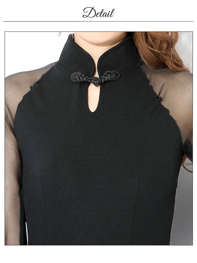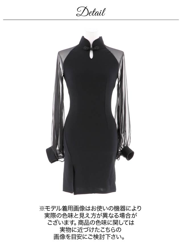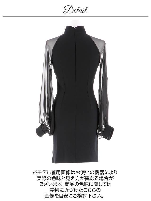 シンプルデザインで着回ししやすい長袖ミニタイトドレス。オールシーズン使える≪ストレッチ素材≫タイプ。シフォン生地から透ける素肌が色っぽい一枚。ワンカラーブラックでスタイリッシュにキメたデザインは無駄な装飾を一切省いたレディライクな一着。ハイネックタイプなので胸をあまり露出したくない方におすすめです。