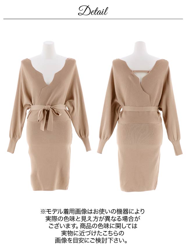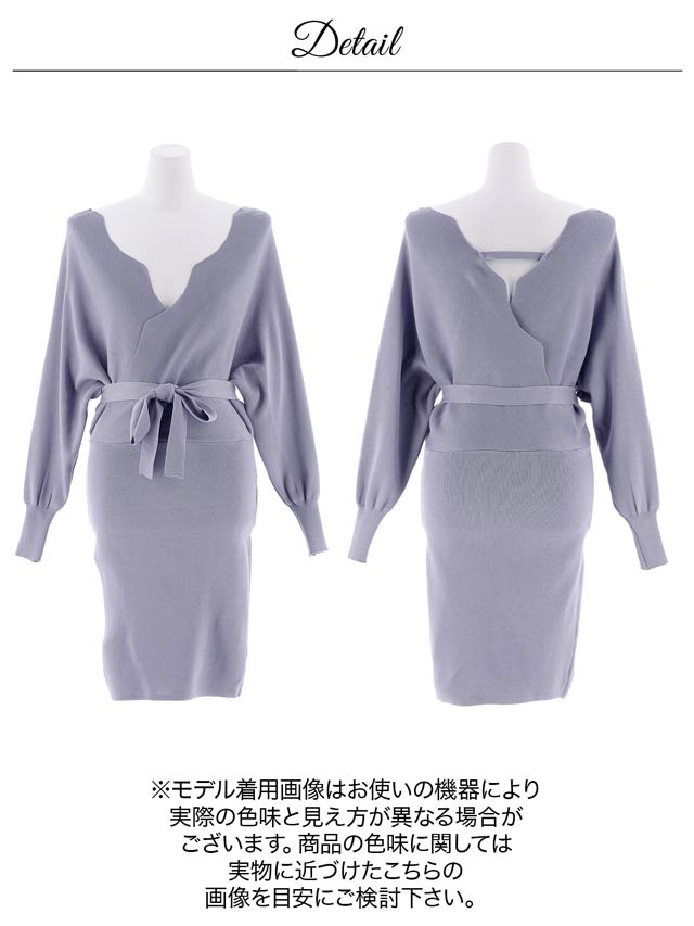 スカラップデザインのオフショルダーが色っぽ可愛いニットワンピース♪ゆったりとしたドルマンスリーブのシルエットがたまらない♪ウエストリボンでくびれをキュッと引き締め◎