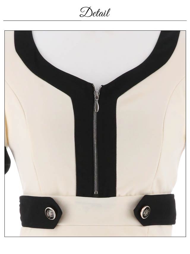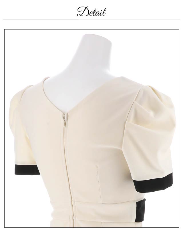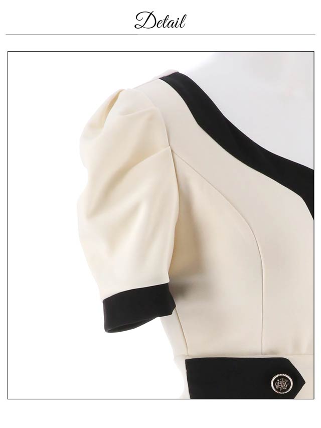 バイカラー配色のラインデザインがお洒落なミニドレス。両サイドからボタンビジューを加えたウエストラインでくびれをしっかりアピール◎ タックを寄せたパフスリーブの半袖が女性らしい1着です♪