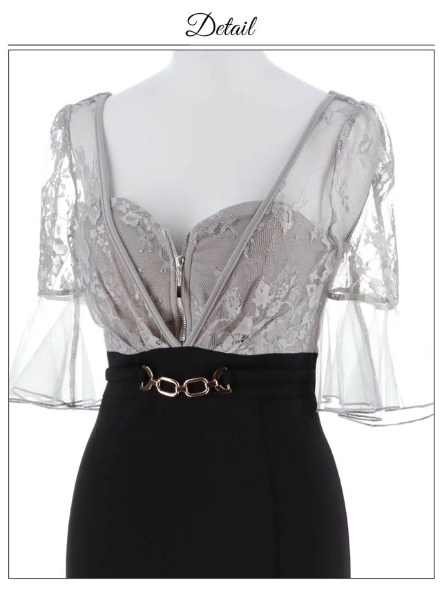 シアーレース×フロントジップでバストを大胆に魅せるセクシーなロングドレス。ふんわり広がるベルスリーブは上品な印象を与えつつ気になる二の腕を華奢見せ◎ハイウエスト切り替えに加え、ウエストマークのベルトモチーフ付きでスタイルアップも叶えてくれます♪