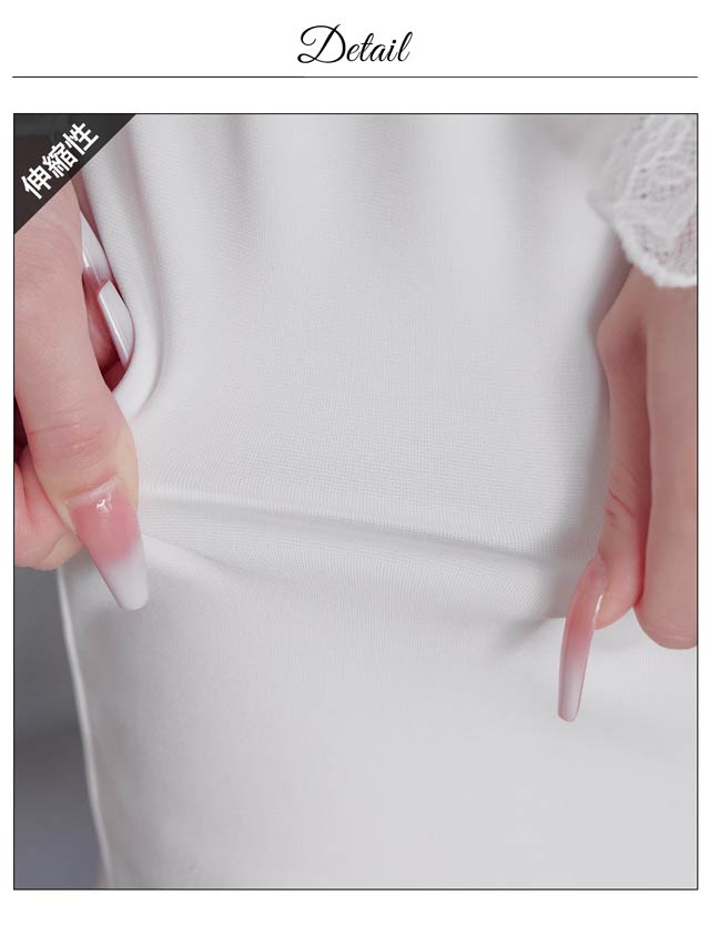 身にまとうだけで清楚で上品な印象を与えるホワイトカラーのキャバドレス。ウエストにきらめくビジューとペプラムが自然なメリハリを生み、スタイルアップ効果も抜群◎透け感のあるレース袖が女性らしさをプラスしつつ二の腕をカバーしてくれるのも嬉しいポイントです!