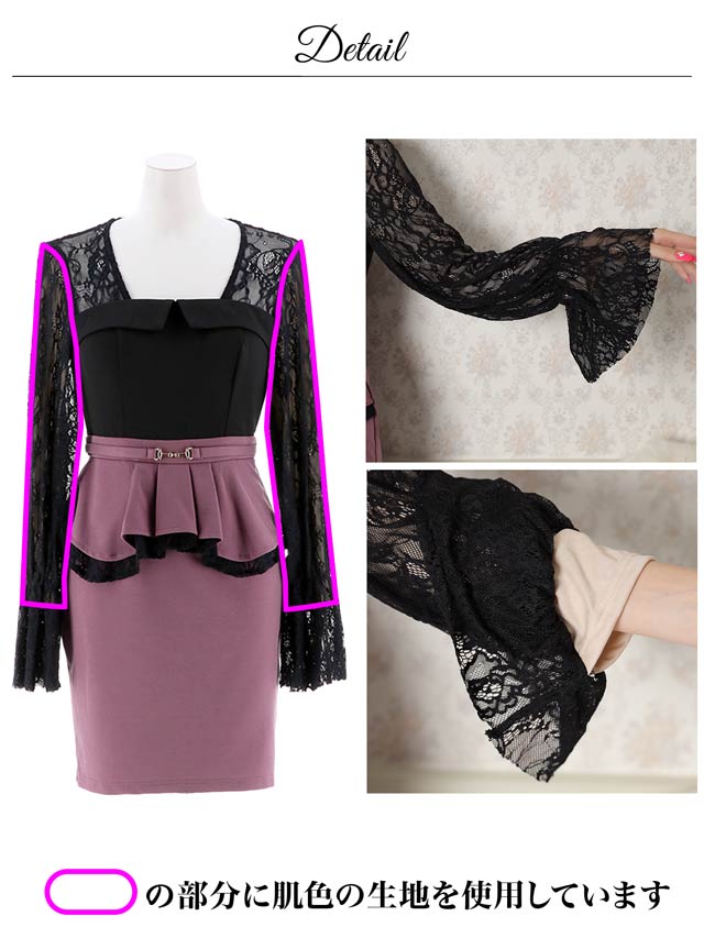 レーススリーブがセクシーな長袖のタイトミニドレス。裾はアンブレラ型で女性らしさをプラス。ペプラムデザインのスカートはくびれ効果を発揮しながらウエスト周りもカバー。可愛さと細見せ効果が両立した一着です。