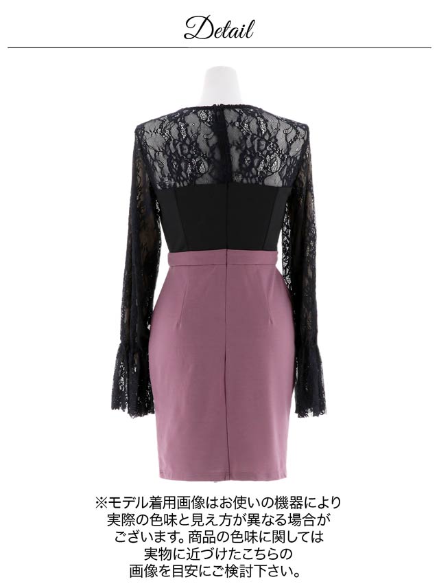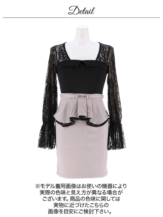 レーススリーブがセクシーな長袖のタイトミニドレス。裾はアンブレラ型で女性らしさをプラス。ペプラムデザインのスカートはくびれ効果を発揮しながらウエスト周りもカバー。可愛さと細見せ効果が両立した一着です。