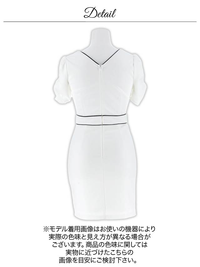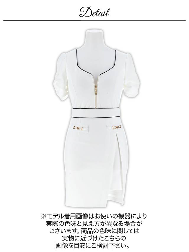 パイピング加工を施したフロントジップ仕様がアクセントになったミニドレス。サイドに大きく入ったスリットスカートがお洒落かつ、こなれ感漂う大人の色気を引き立たせます◎ ギャザーを寄せたパフスリーブで可愛らしさも欠かさない1着です。