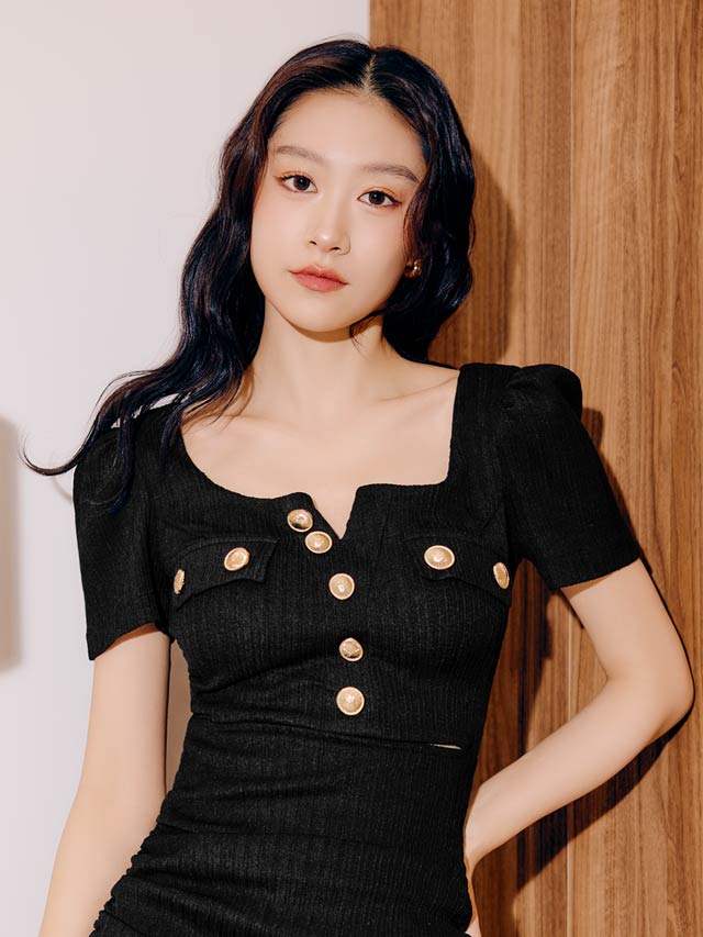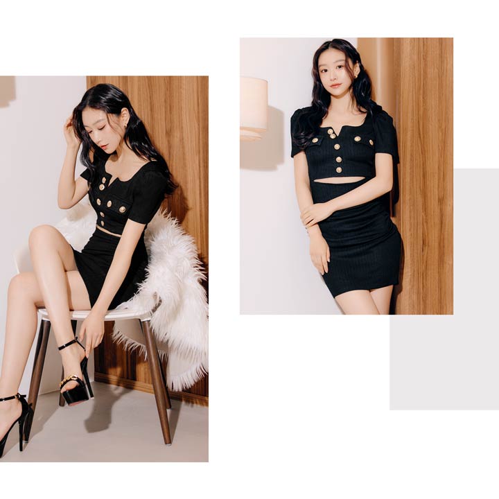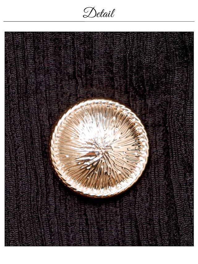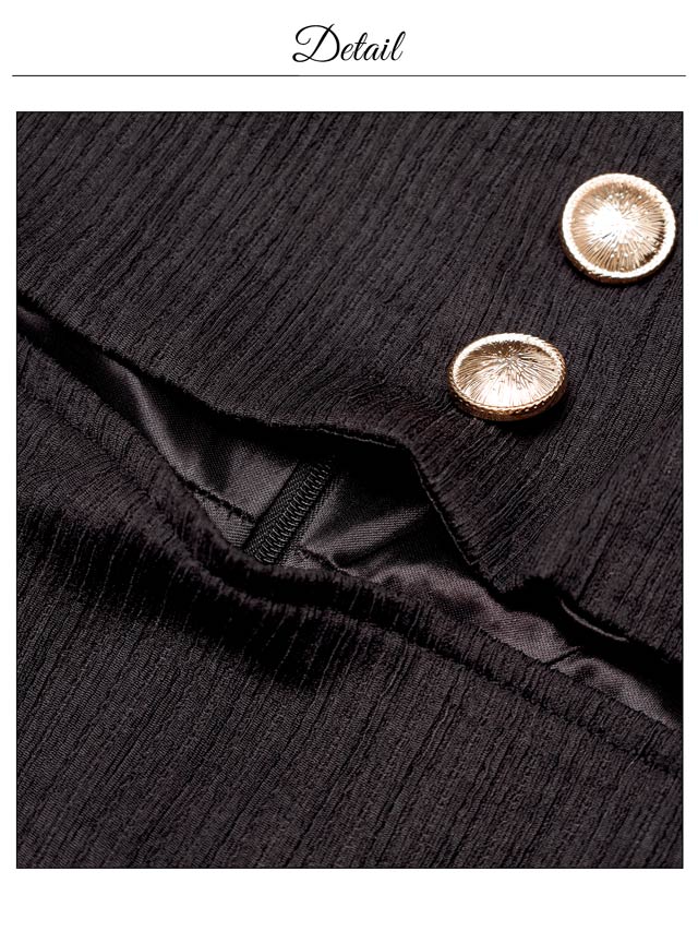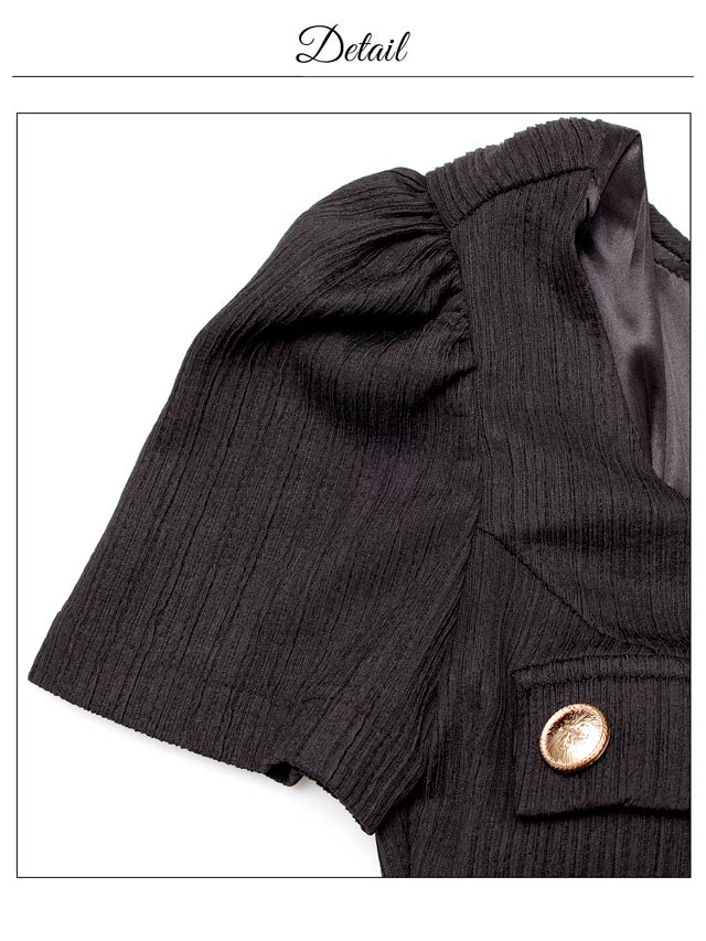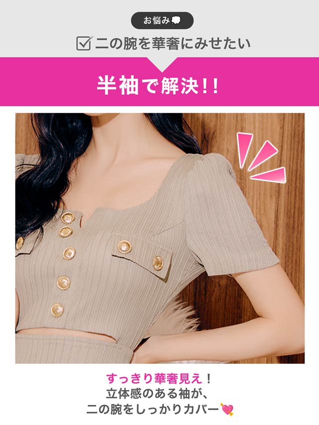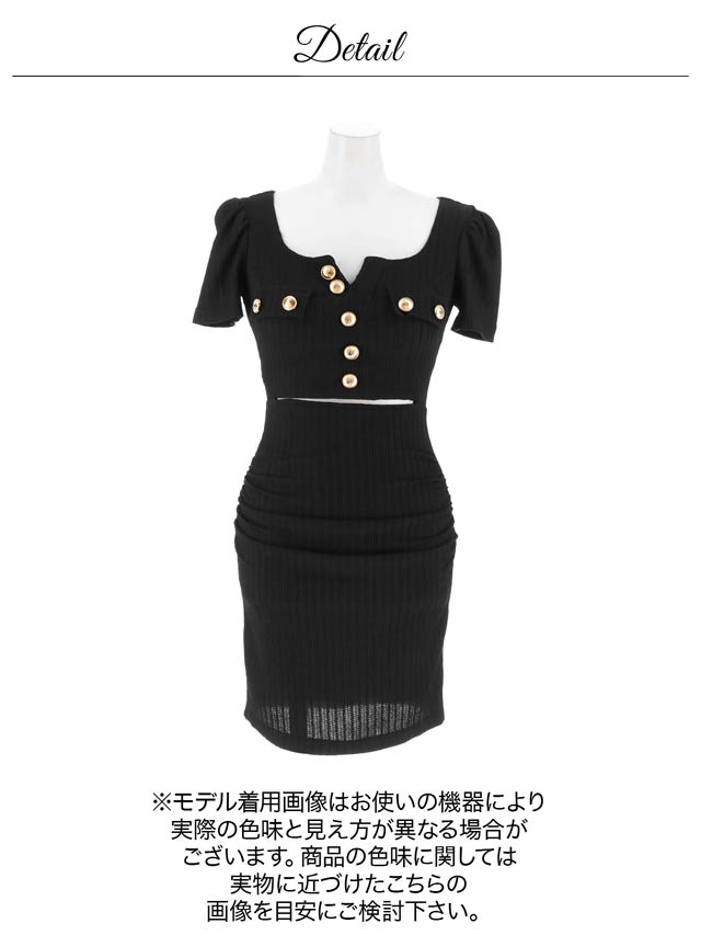 洗練された雰囲気漂うシンプルなデザインに、きらめくゴールドボタンがアクセントになったキャバドレス。デコルテを美しくすっきりと見せるスクエアネックで女性らしさを引き立てます。ウエストカットの肌見せが腰の位置を高く見せ、脚長効果も叶える一着です♪