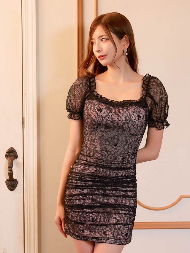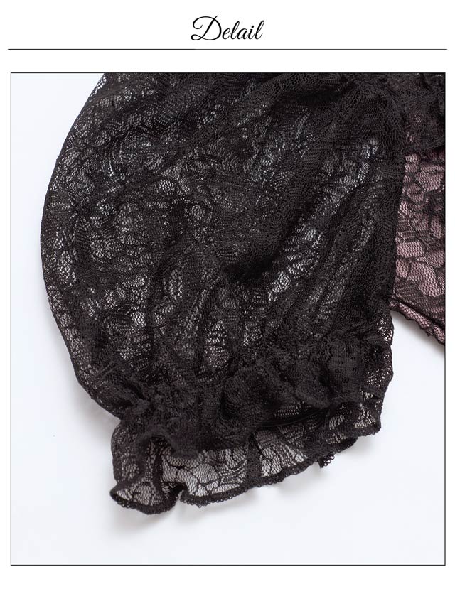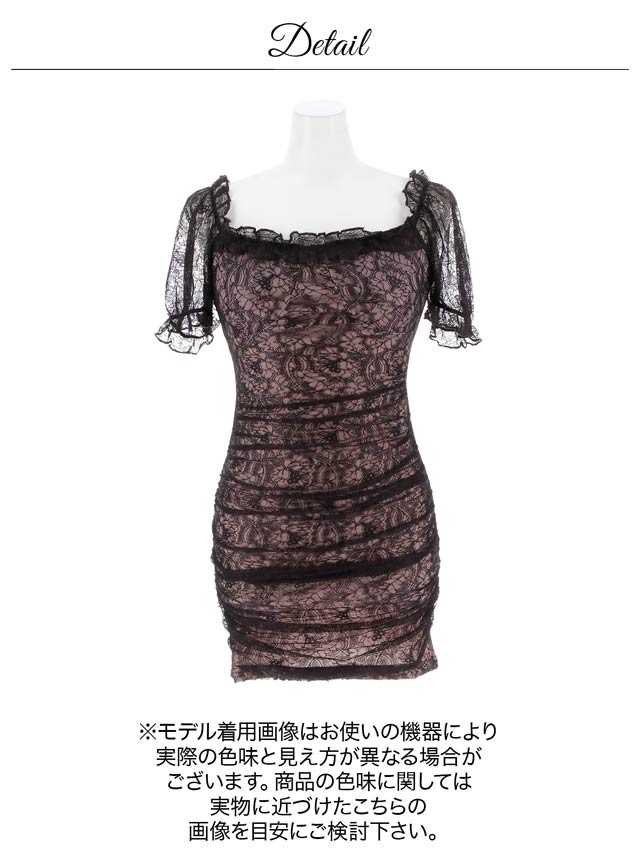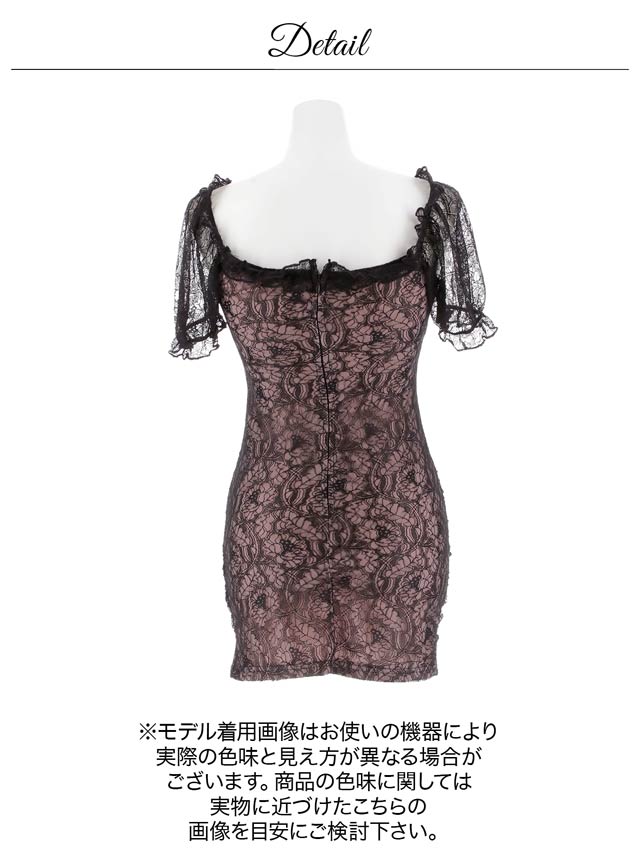 透け感のあるフラワーレース素材を全面にあしらった上品なミニドレス。フリルのデコルテ部分が程よい甘さを加えてくれるアクセントに◎ ふんわりとしたオフショル袖は2way仕様でお好みで肌の見せ方を変えられる1着です。