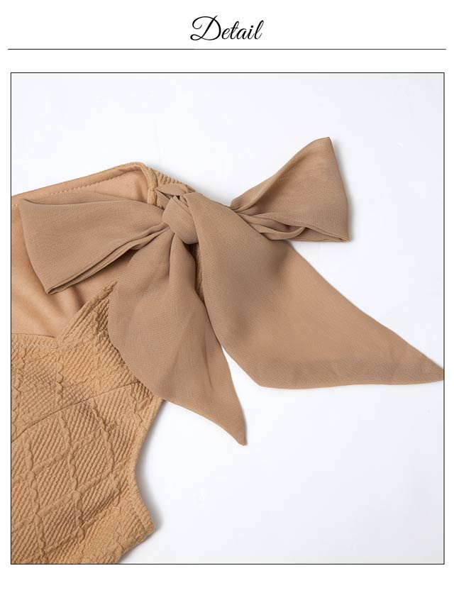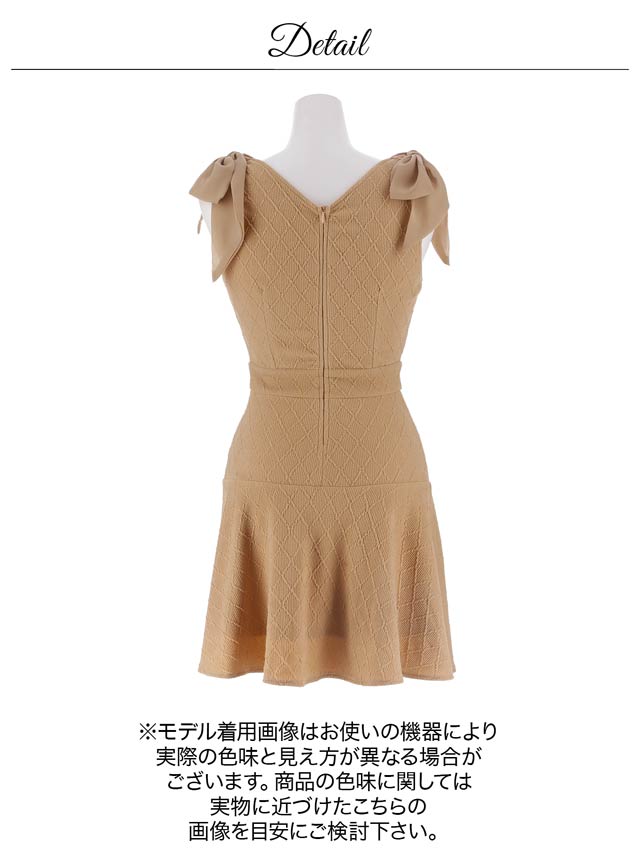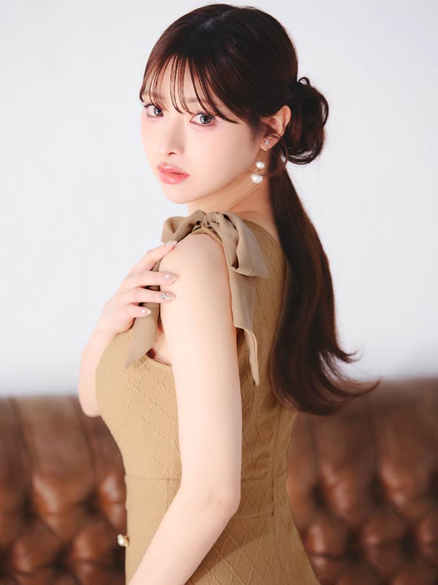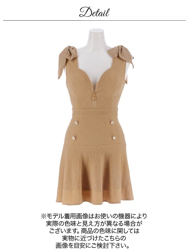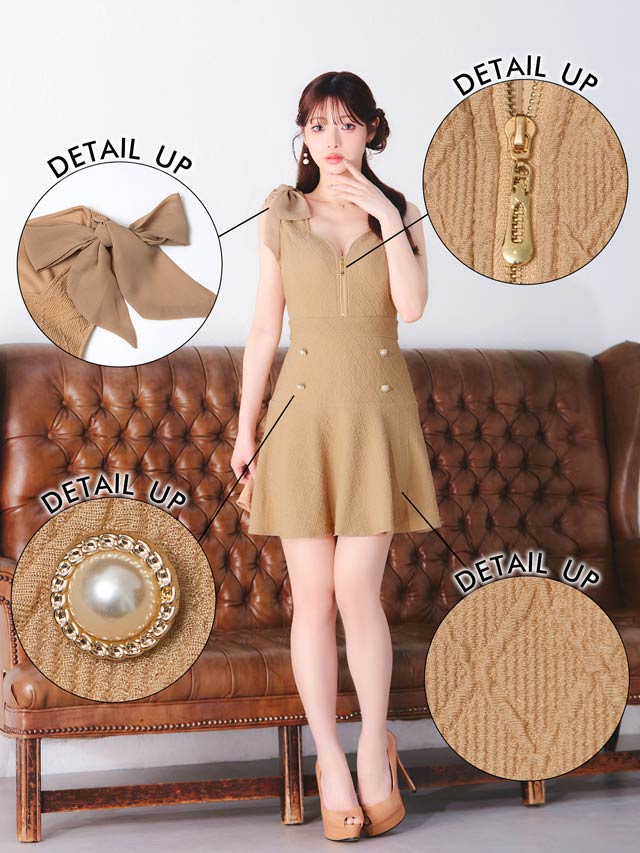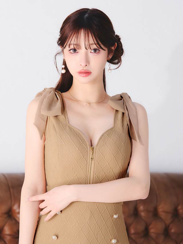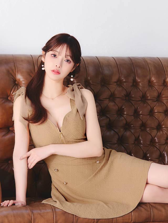 ショルダーリボンとパールボタンが可愛らしいアクセントになり、フェミニンな印象を演出するキャバドレス。胸元のジップで谷間をキレイに魅せ、甘さの中にセクシーさをプラス!ふんわり広がるAラインスカートがお尻まわりを自然にカバーしてくれます♪