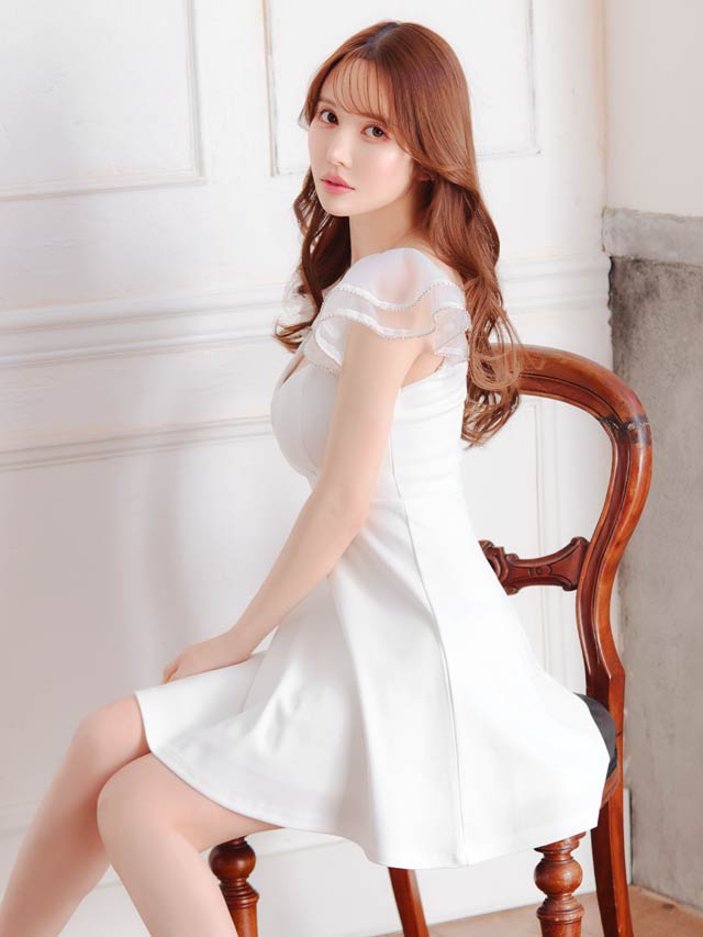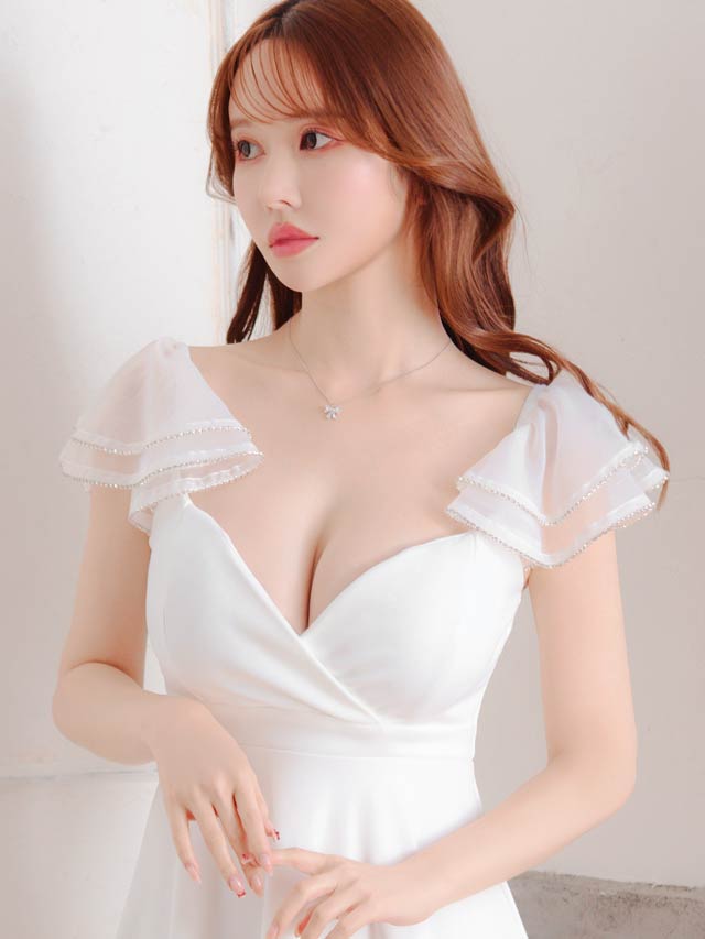 深めのVカットが印象的なカシュクールデザインで谷間を美しく引き立てるキャバドレス。ラインストーンをあしらったフリル袖が肩まわりを華奢に見せつつ、上品な華やかさをプラス♪ふんわり広がるAラインスカートでお尻まわりをカバーできるのもポイントです◎
