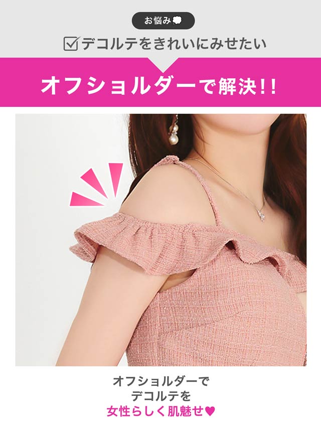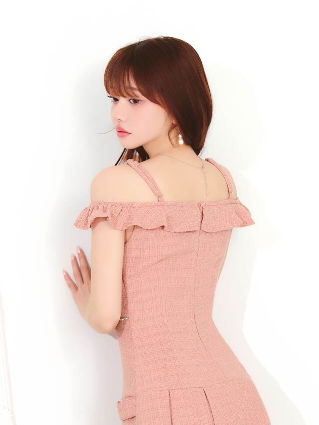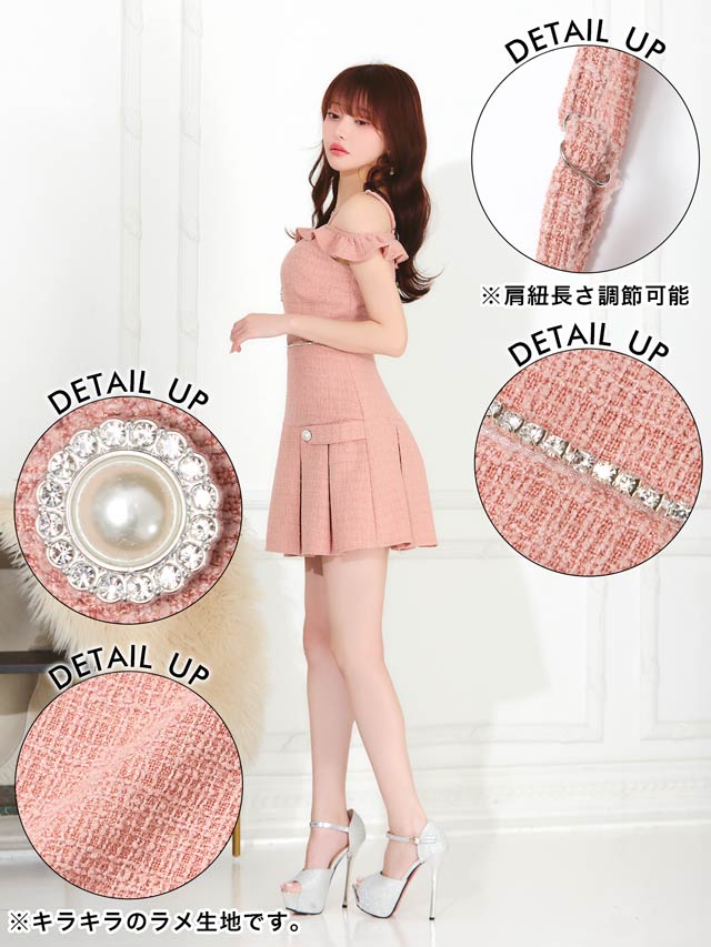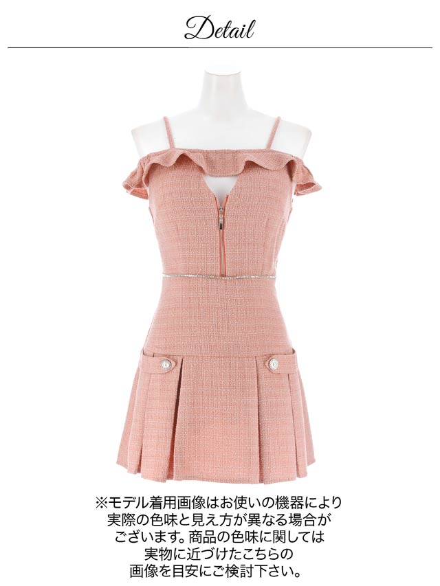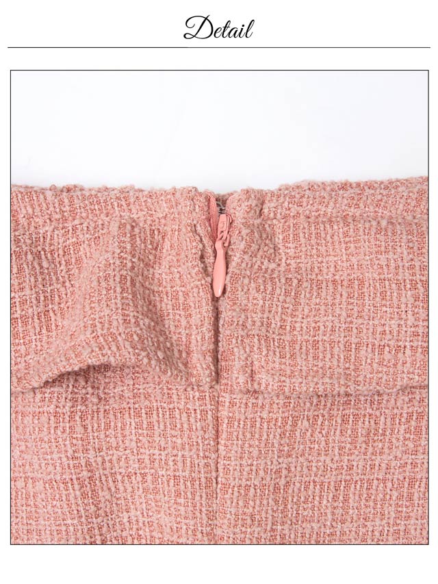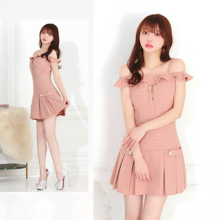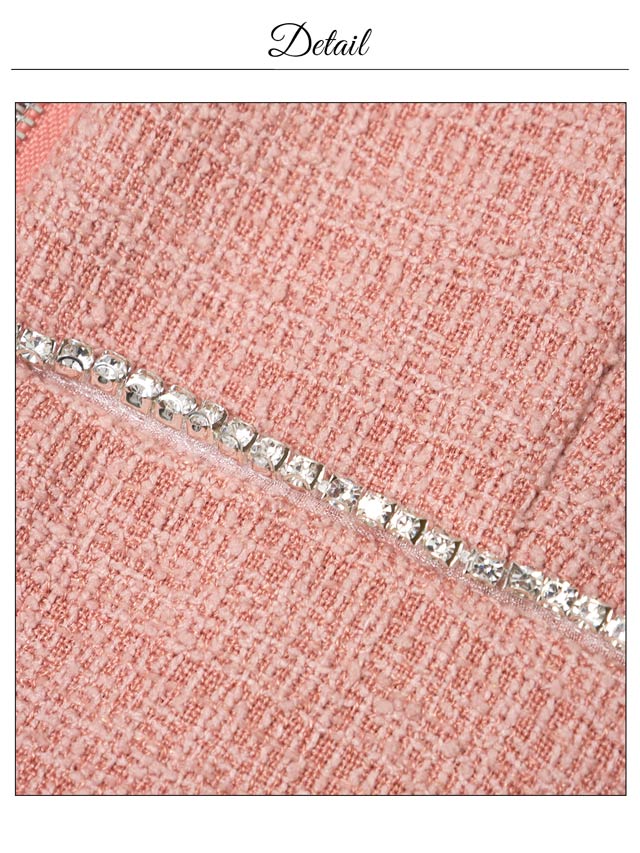 上品なツイード生地にウエストのラインストーンが映える、高見え感たっぷりのキャバドレス。甘めな印象ながら、フロントジップ仕様で谷間を色っぽく際立たせる一着◎Aラインのプリーツスカートが気になるお尻まわりも自然にカバーしてくれます!