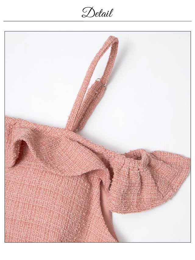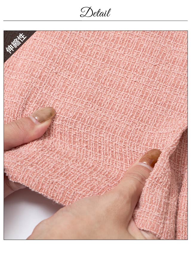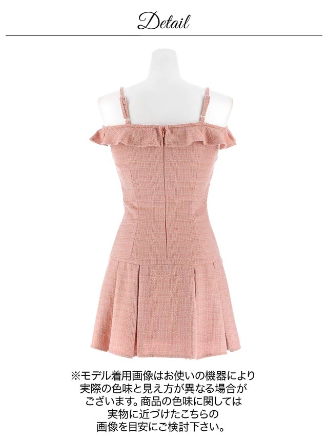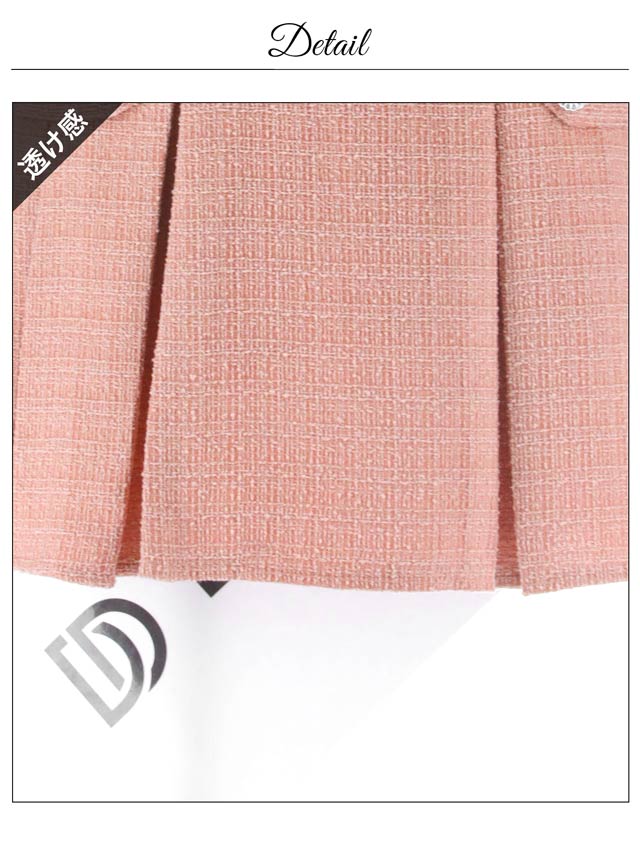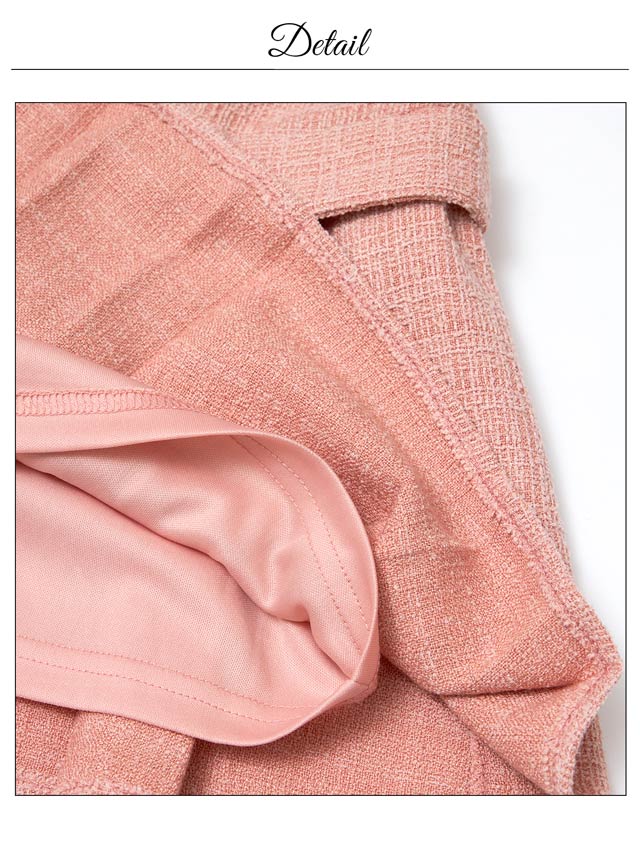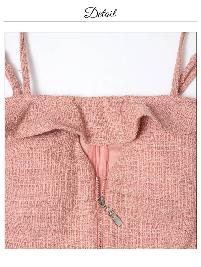 上品なツイード生地にウエストのラインストーンが映える、高見え感たっぷりのキャバドレス。甘めな印象ながら、フロントジップ仕様で谷間を色っぽく際立たせる一着◎Aラインのプリーツスカートが気になるお尻まわりも自然にカバーしてくれます!