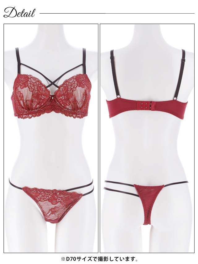 大柄のフラワーレースをあしらった大人なカラーリングのランジェリー。胸元のクロスコードと、アシンメトリーなショーツが目を惹く色気たっぷりのデザイン♪中心にはラインストーンチャームがさりげなくきらめき、上品なアクセントを添えています◎