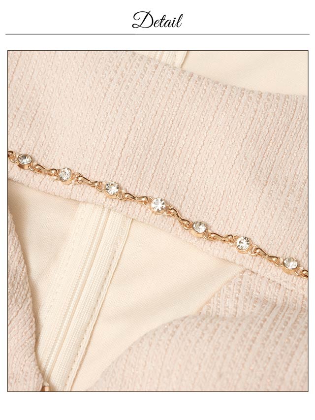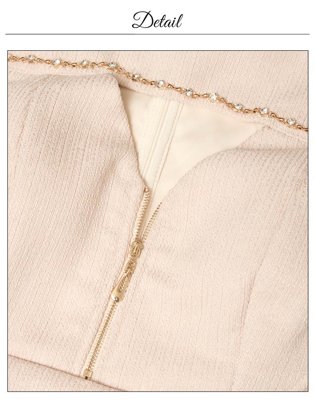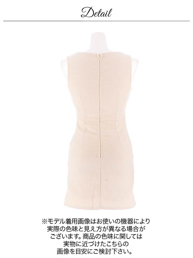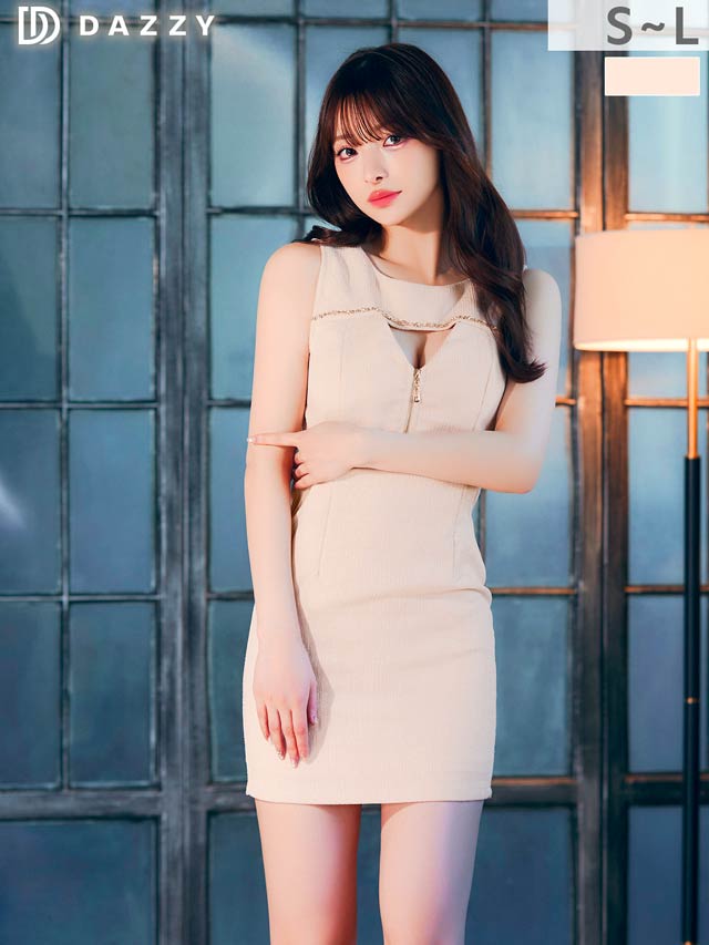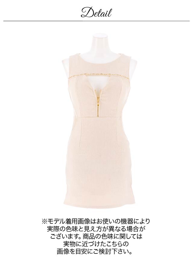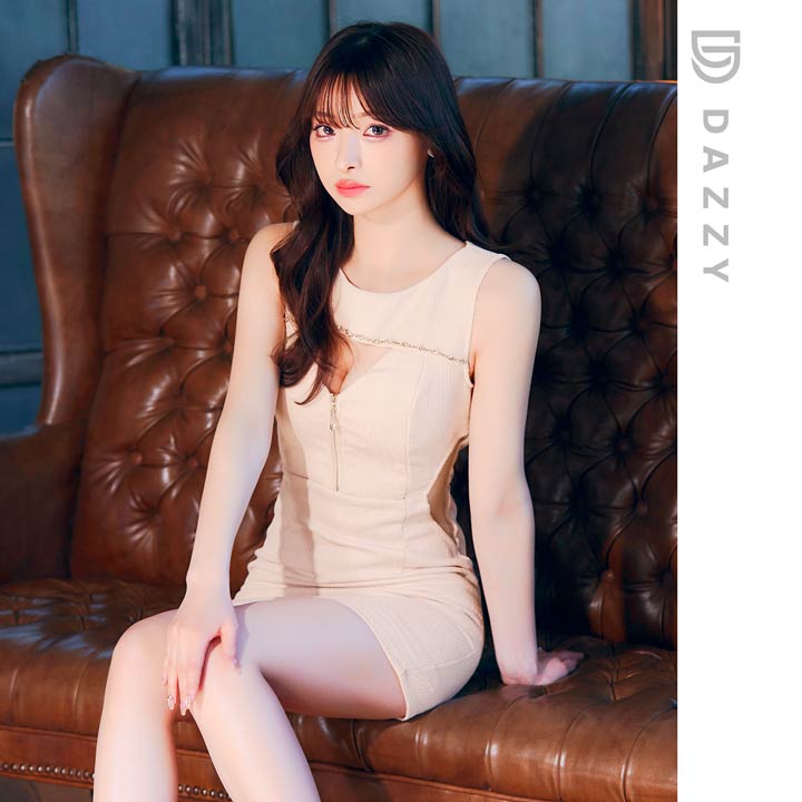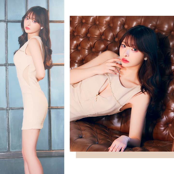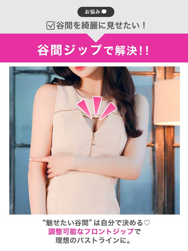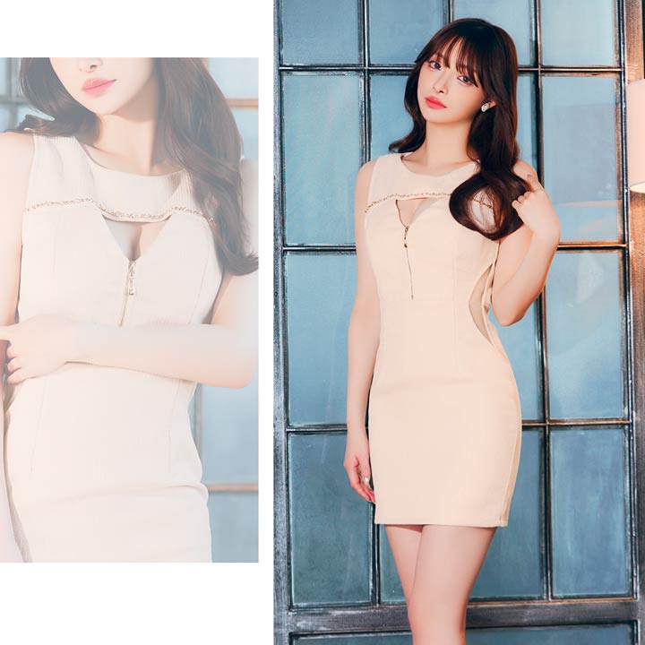 くびれのシアーデザインとフロントジップが程よい肌見せで視線を惹きつけるキャバドレス。デコルテのビジューラインが華やかさをプラスし、シンプルながらも高級感のある印象に◎ 洗練された大人の色気を演出する1着です。