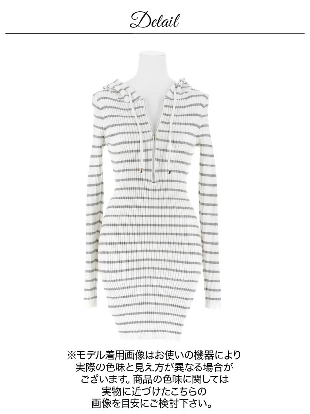 カジュアルさと女性らしさを兼ね備えたフード付きのボーダー柄ニットワンピース。身体にフィットするタイトなリブニットがメリハリのあるシルエットを演出♪フロントジップで胸元の見せ方をお好みで調節できるのもポイントです◎