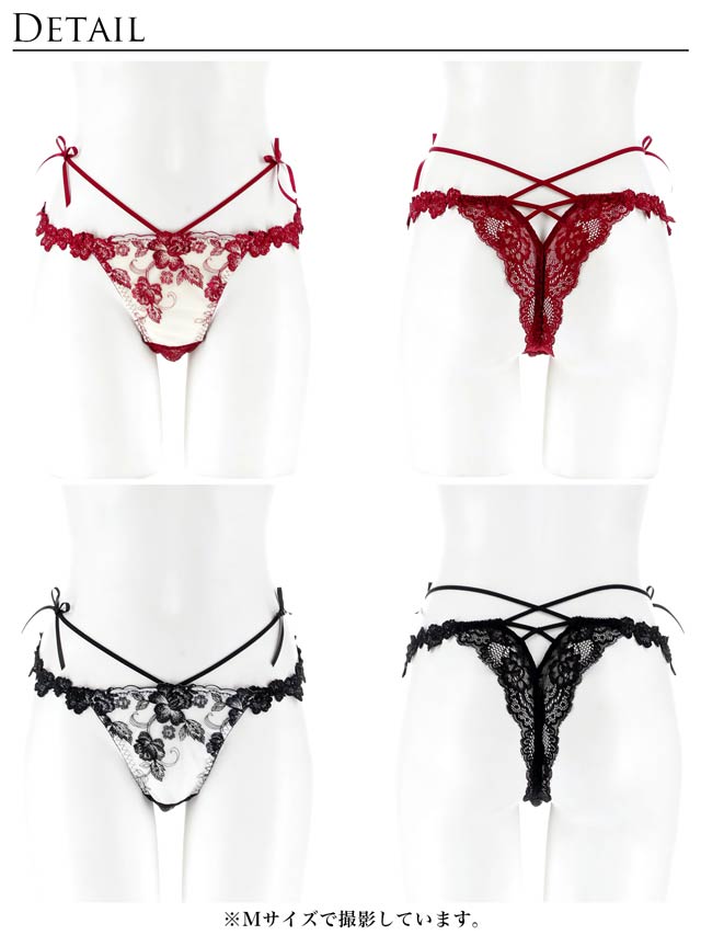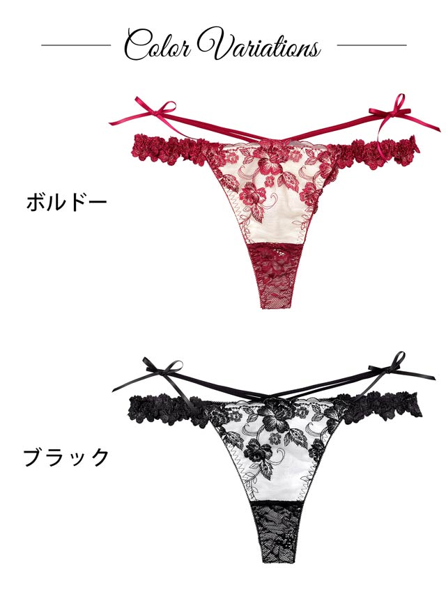美しいラメ入りのフラワー刺繍が繊細なきらめきを放つランジェリー。サイドを飾るケミカルレースがラグジュアリーな存在感をプラス。さらにリボン付きのコードをあしらい、腰まわりを色っぽく演出します。