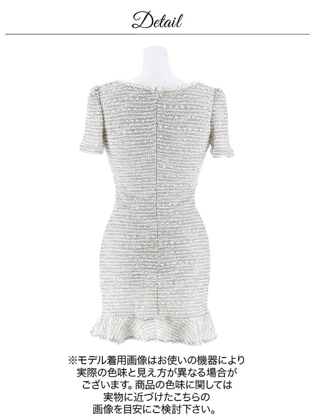 上品なツイード調素材で仕立てた大人クラシカルな雰囲気のミニドレス。カーブを描くネックラインでバストを綺麗に魅せ、フロントジップでさらにセクシーさをプラス♪裾にかけて広がるマーメイドシルエットが女性らしい曲線美を引き立てる一着です。