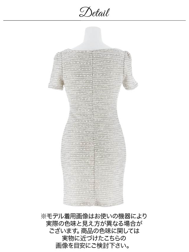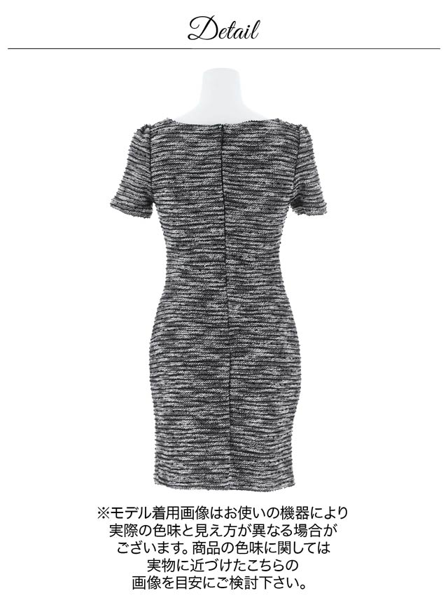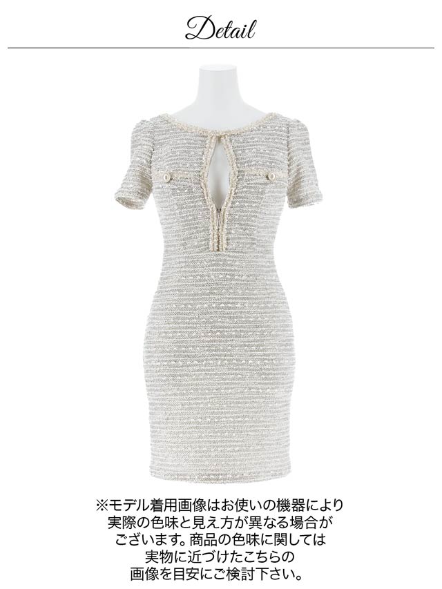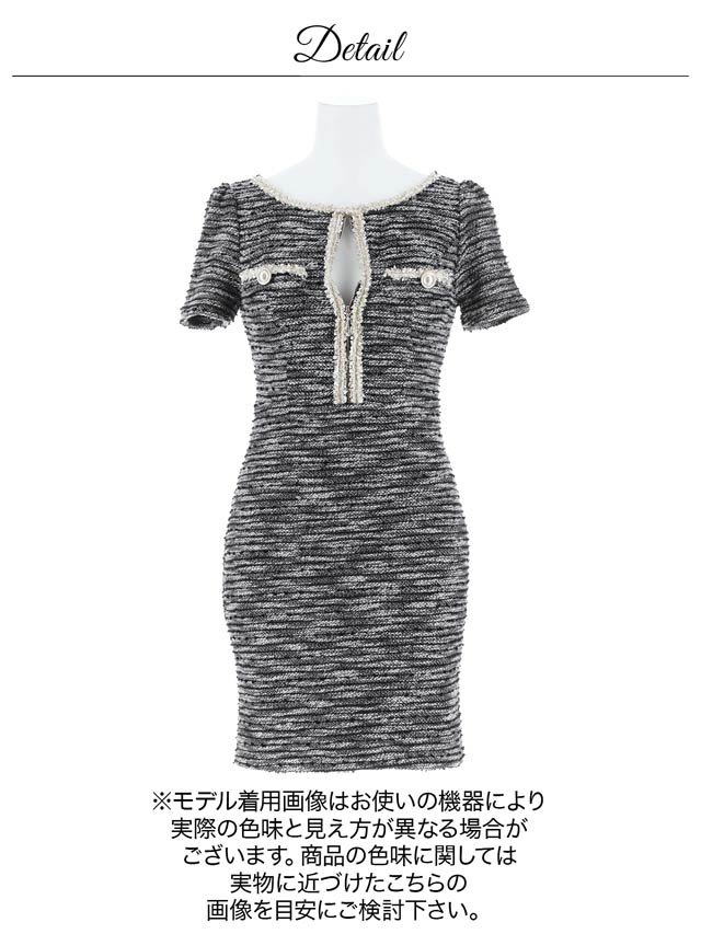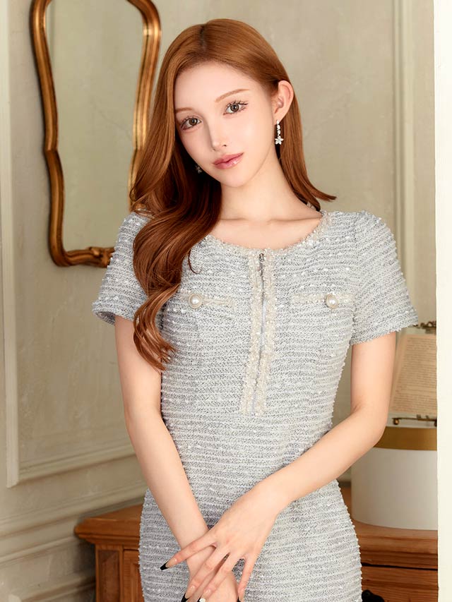 上品な谷間魅せが叶う人気のフロントジップドレス。上品なツイードを全面にあしらい、ジップやネック周りのパイピング加工でメリハリのあるデザインに仕上げました◎ ポケットモチーフのパールビジューも気品溢れる1着です。