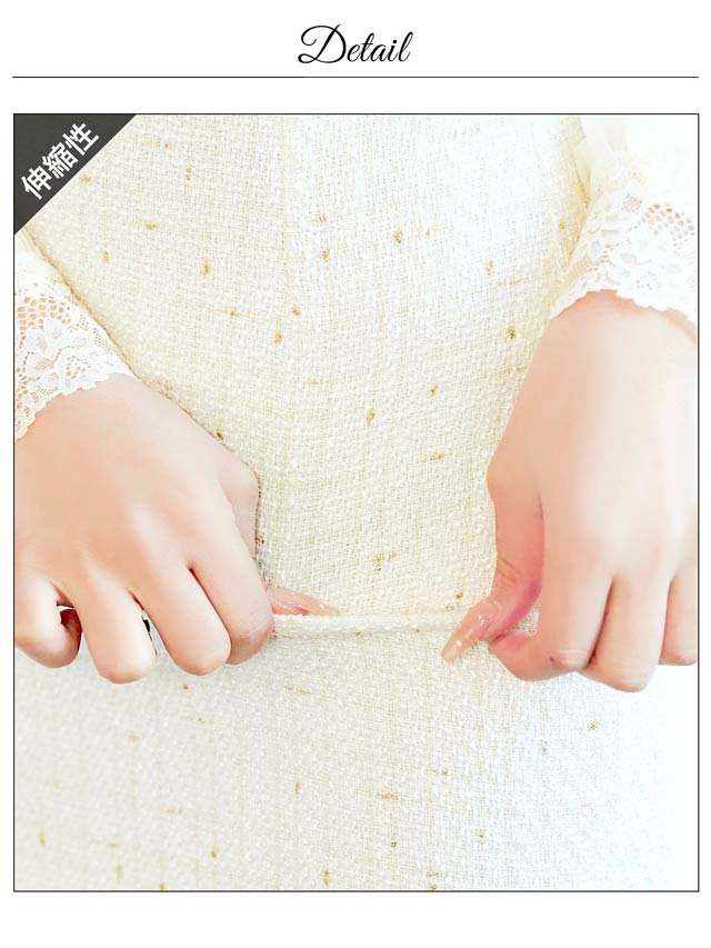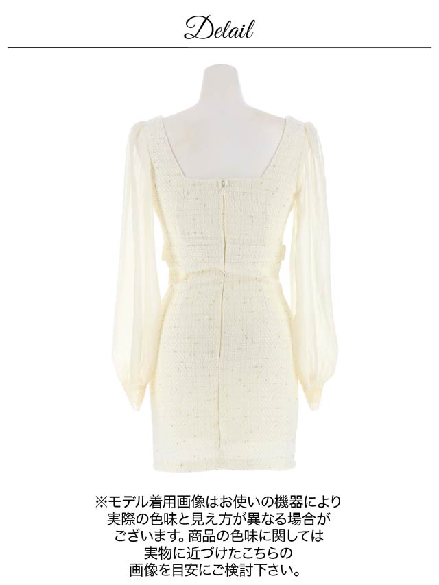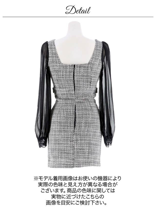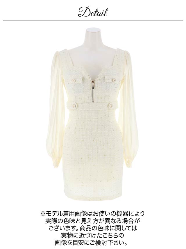 高級感のあるラメツイード素材にパールボタンをあしらった大人上品なミニドレス。人気のフロントジップ仕様で谷間の魅せ方をお好みに合わせて調節可能♪ほんのり透け感のある長袖付きなので気になる二の腕もすっぽりカバーしてくれます◎