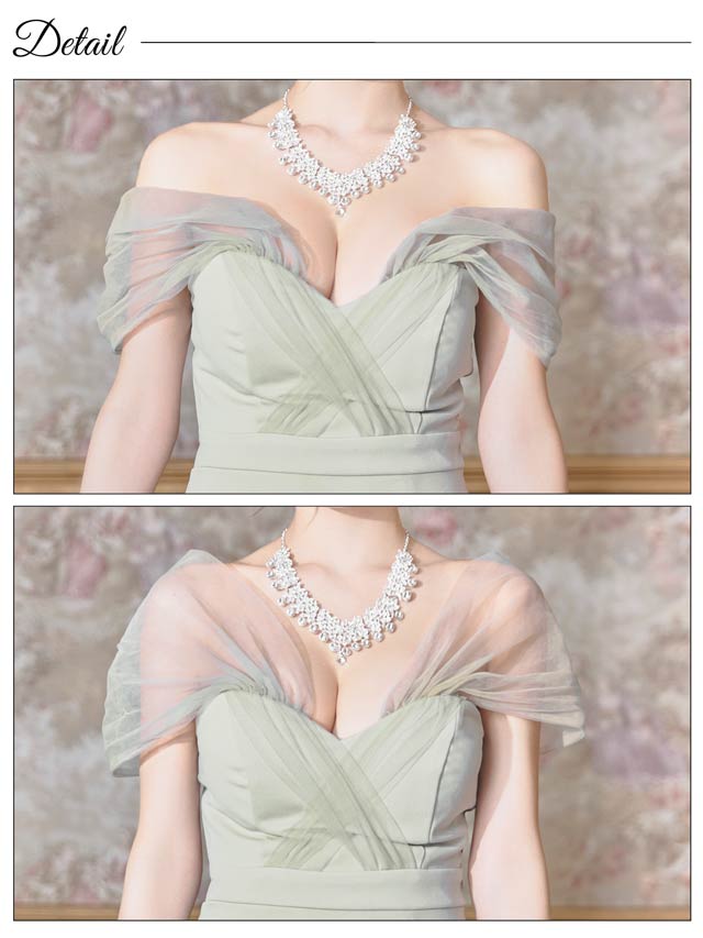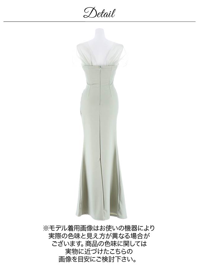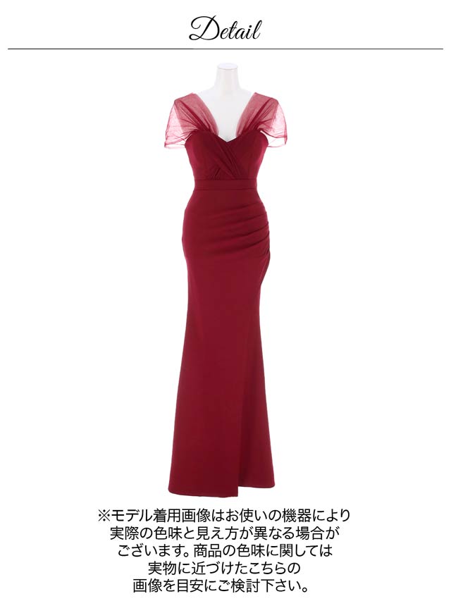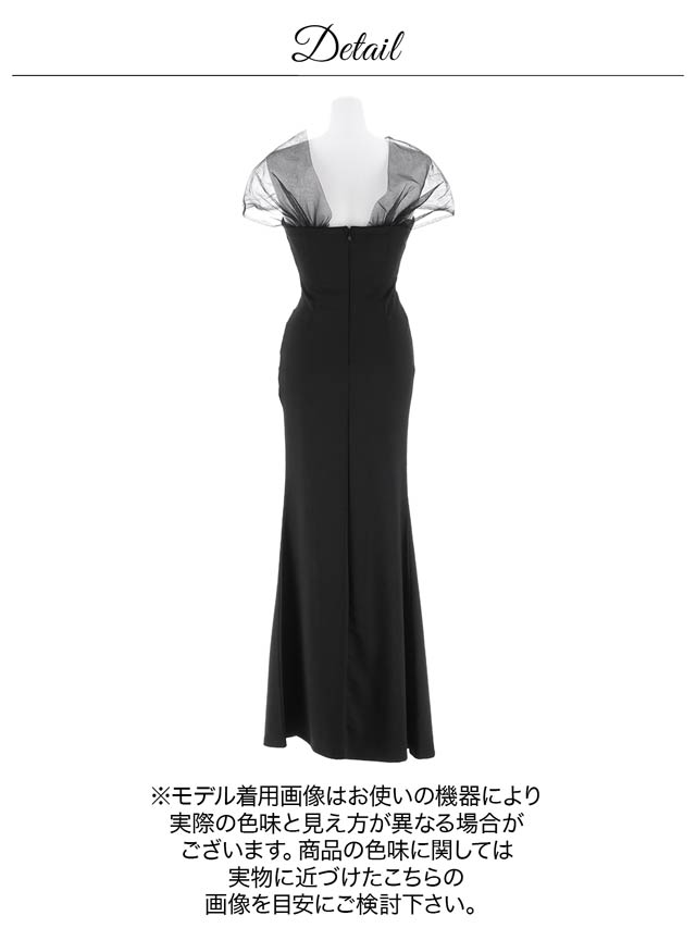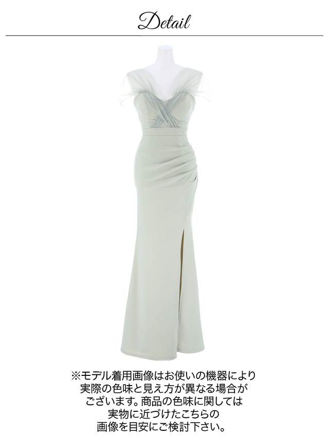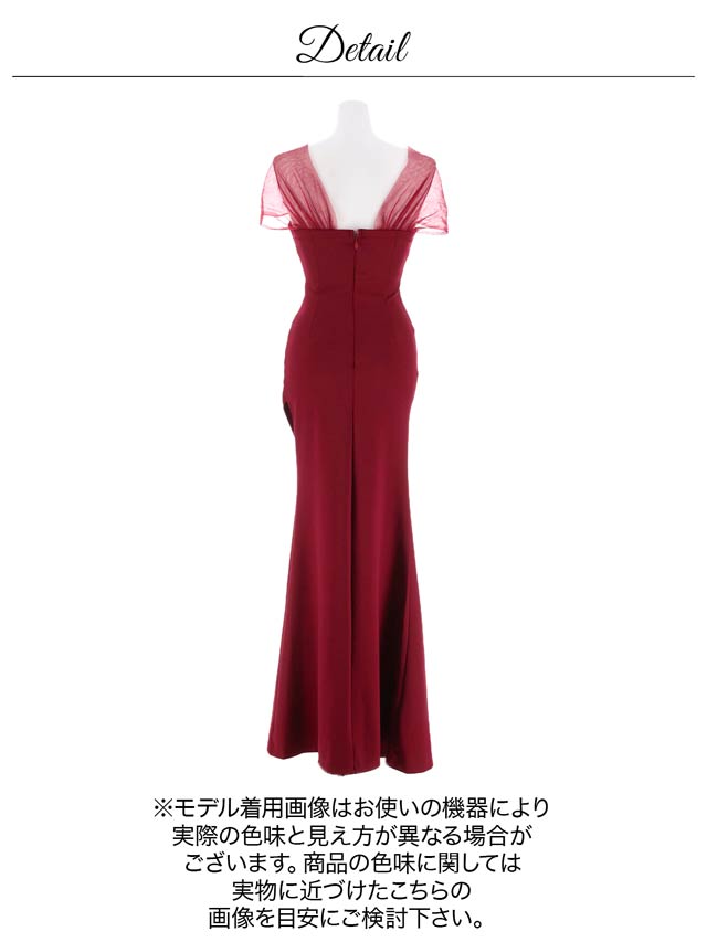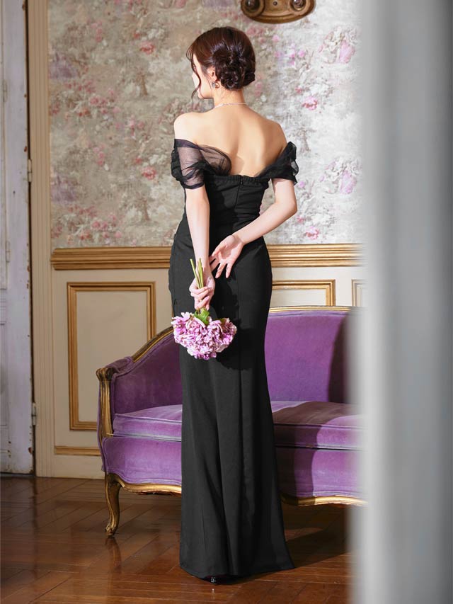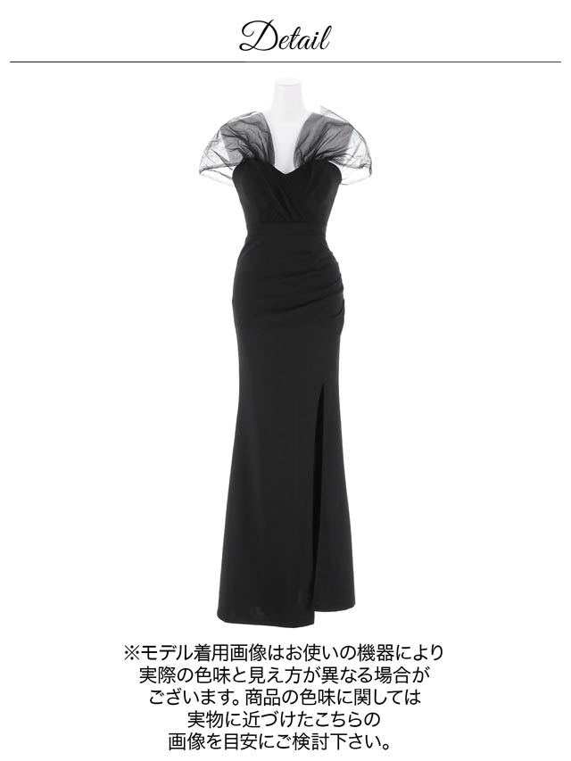 人気の女神袖デザイン×ロング丈のエレガントなドレス。ふんわりとしたチュールが二の腕の華奢見せも叶えてくれます♪深めのスリットスカートが太腿を色っぽく演出してくれる1着です♪