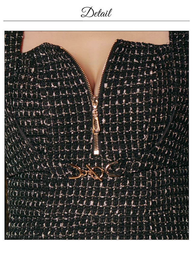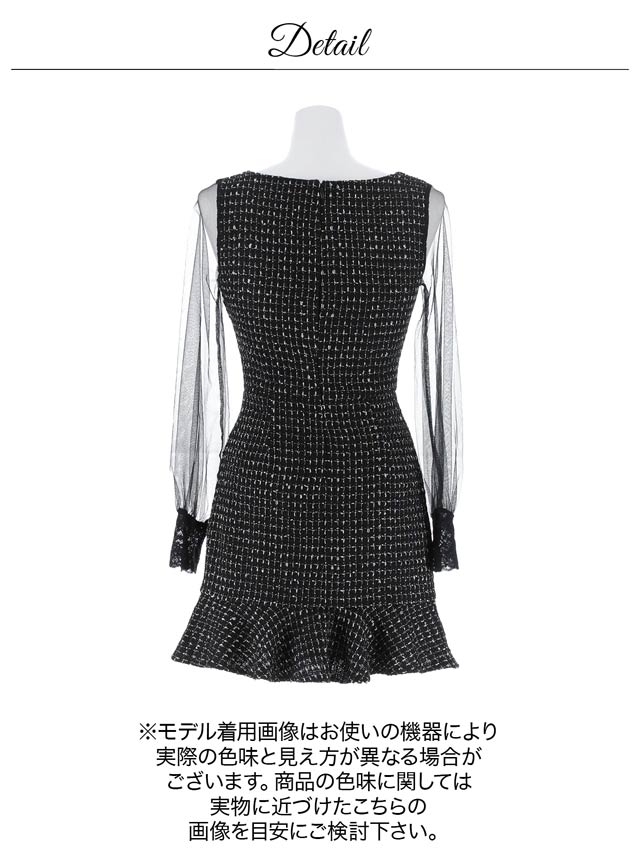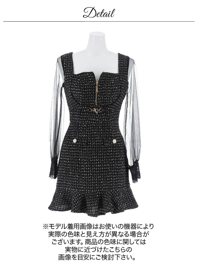 上品なツイード素材を使用した華やかさと高級感を漂わせるミニドレス。人気のフロントジップは露出を控えめにしたり谷間をアピールしたりとお好みのアレンジが可能◎ほどよく透けるシアー袖で抜け感を演出しつつ、二の腕カバーもできちゃいます♪