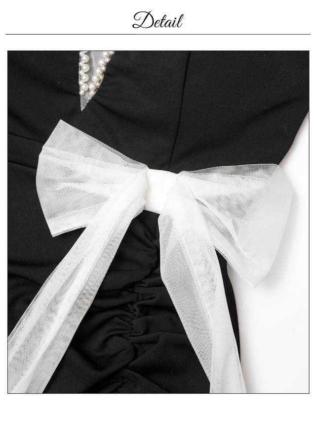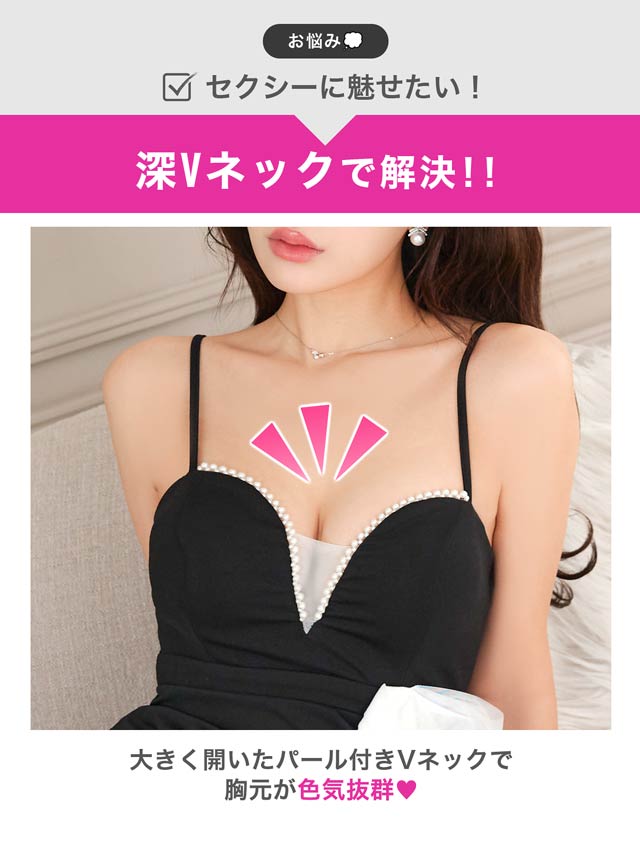 ウエストサイドのシフォンリボンが甘さと華やかさを演出するキャバドレス。胸元には艶やかなパールを施し高級感をプラスしました◎ 深めVカットでデコルテを美しく魅せる色気たっぷりな1着です。