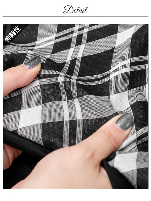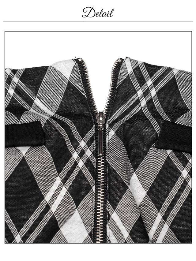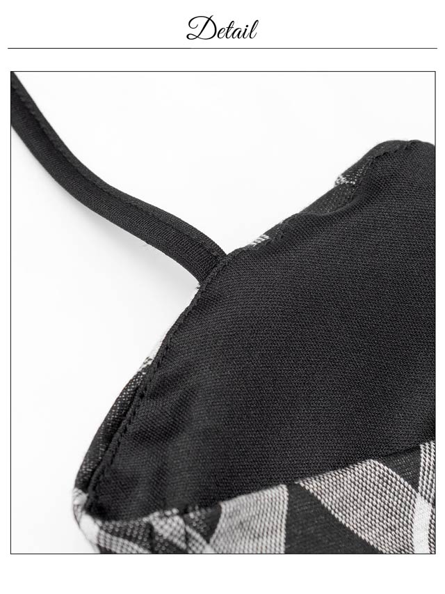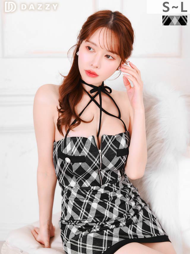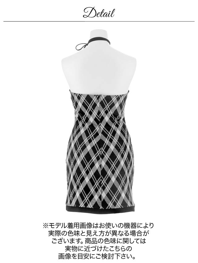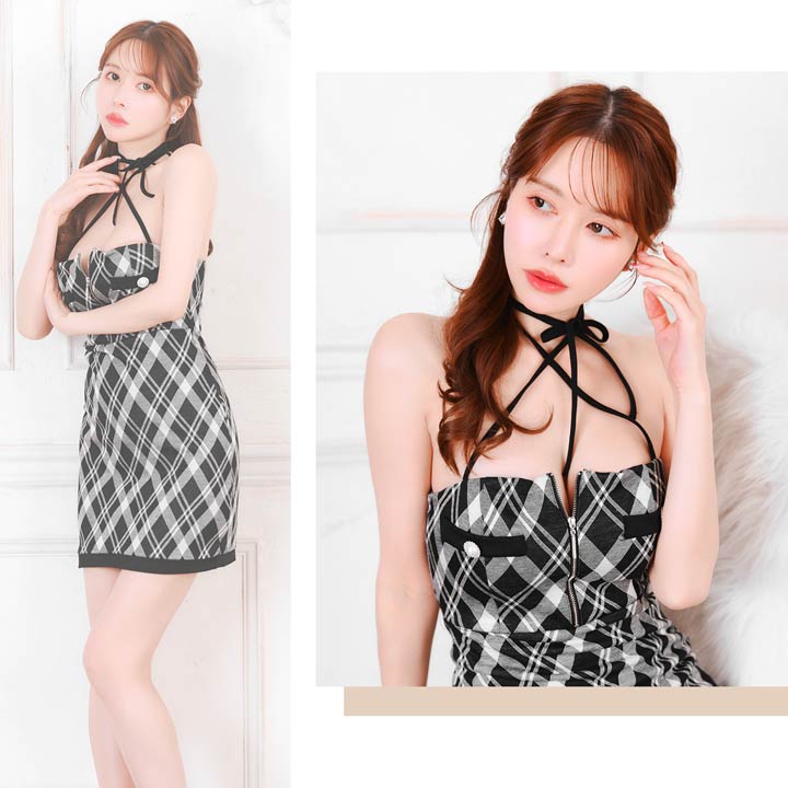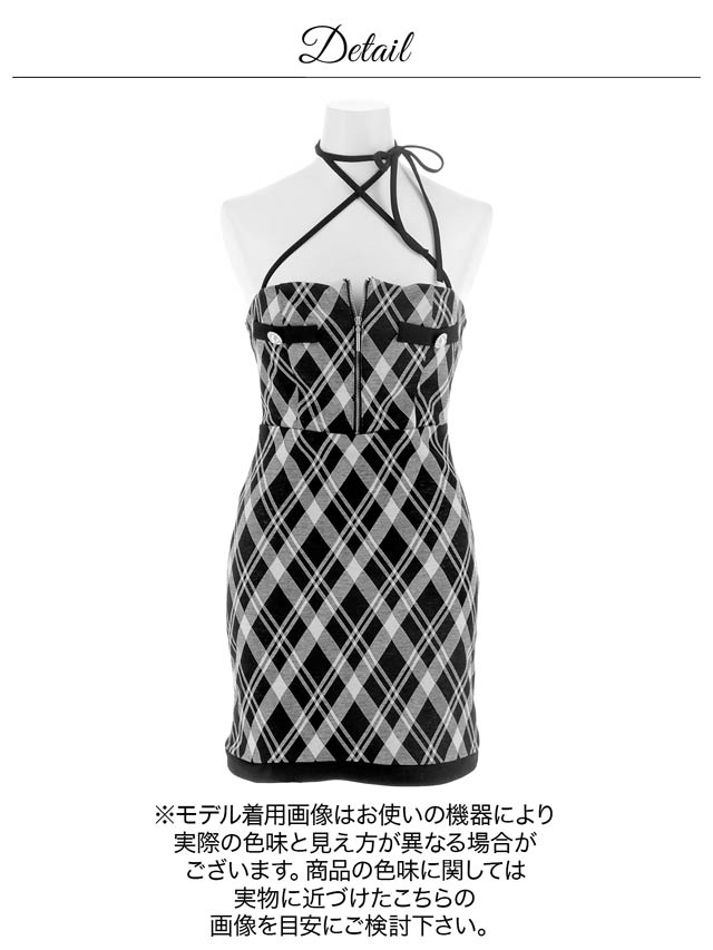 クラシカルなチェック柄にセクシーなホルターネックを組み合わせた大人可愛いキャバドレス。首元のクロスストラップは顔まわりを華やかに見せ、小顔効果もばっちり◎フロントジップ仕様で谷間の魅せ方をお好みでアレンジ出来るのもポイントです。