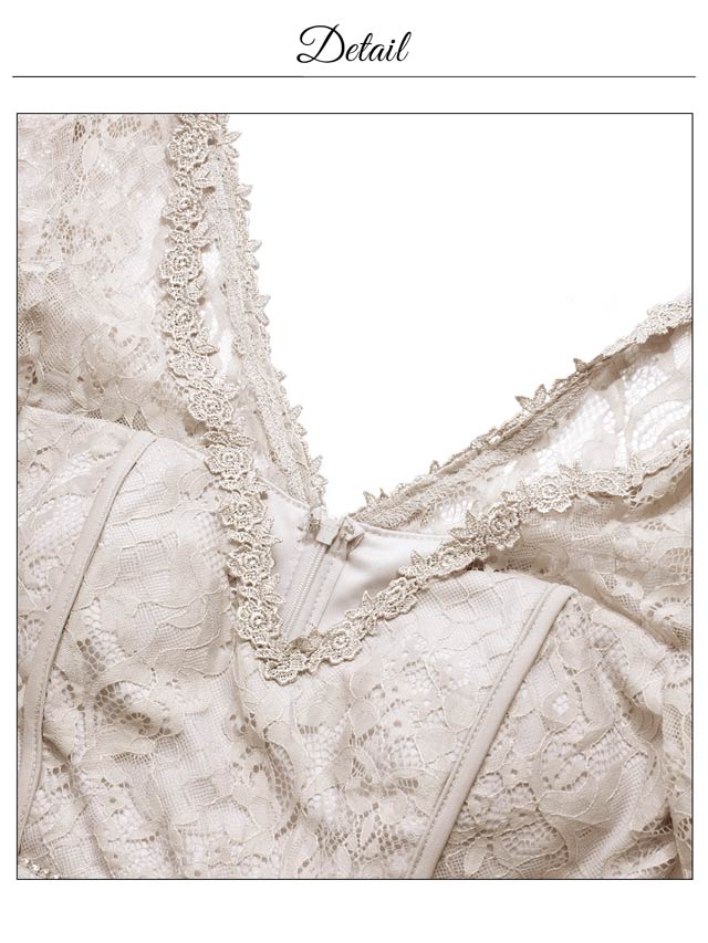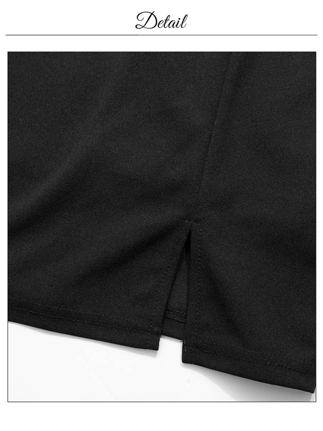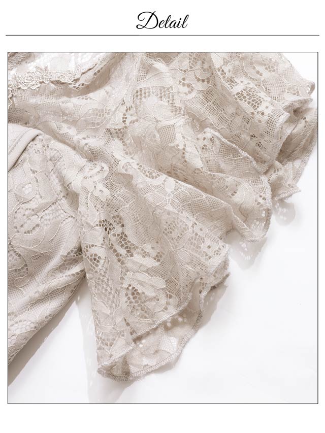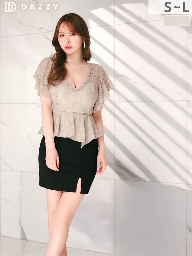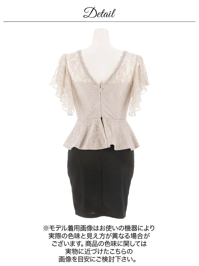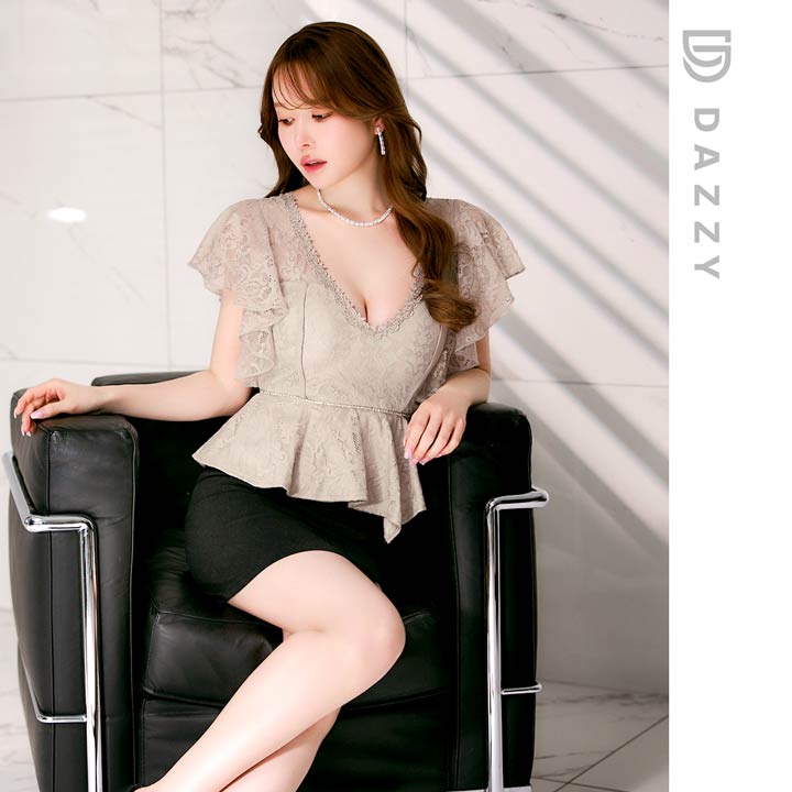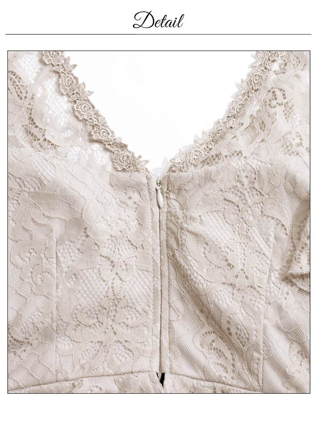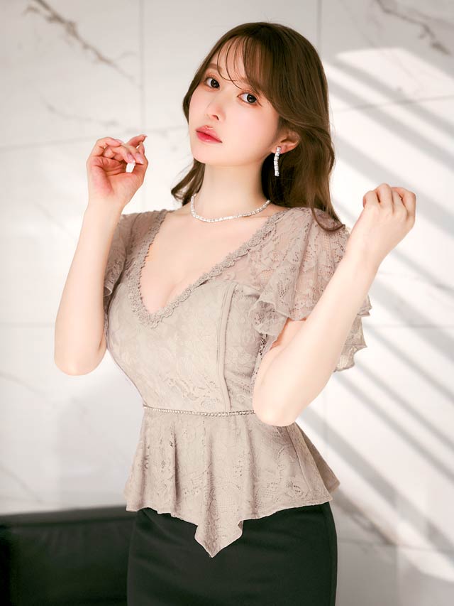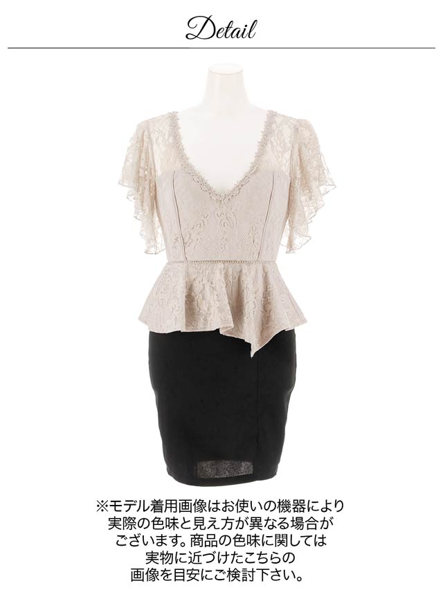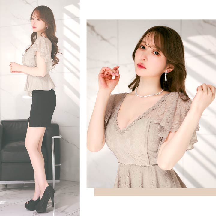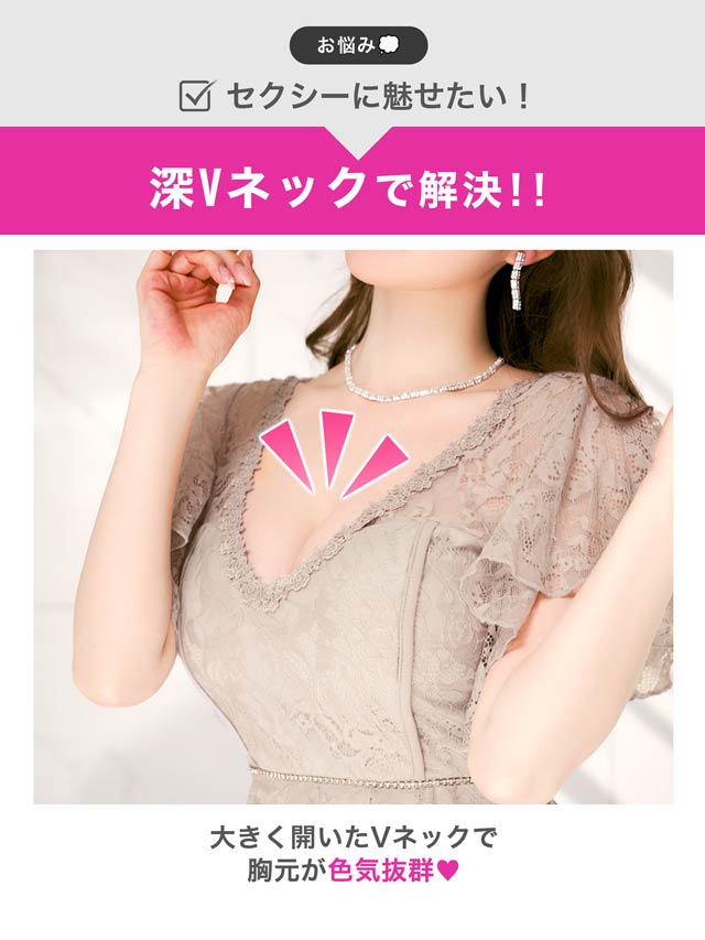 総レースデザインが女性らしさを引き立てる上品なキャバドレス。デコルテは深めのVネックで顔周りをすっきり見せつつ、大人セクシーな雰囲気に◎ ふんわりとしたペプラムデザインとフレアスリーブは気になる体型をさり気なくカバーしてくれるのもポイントです。