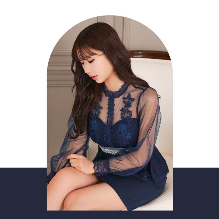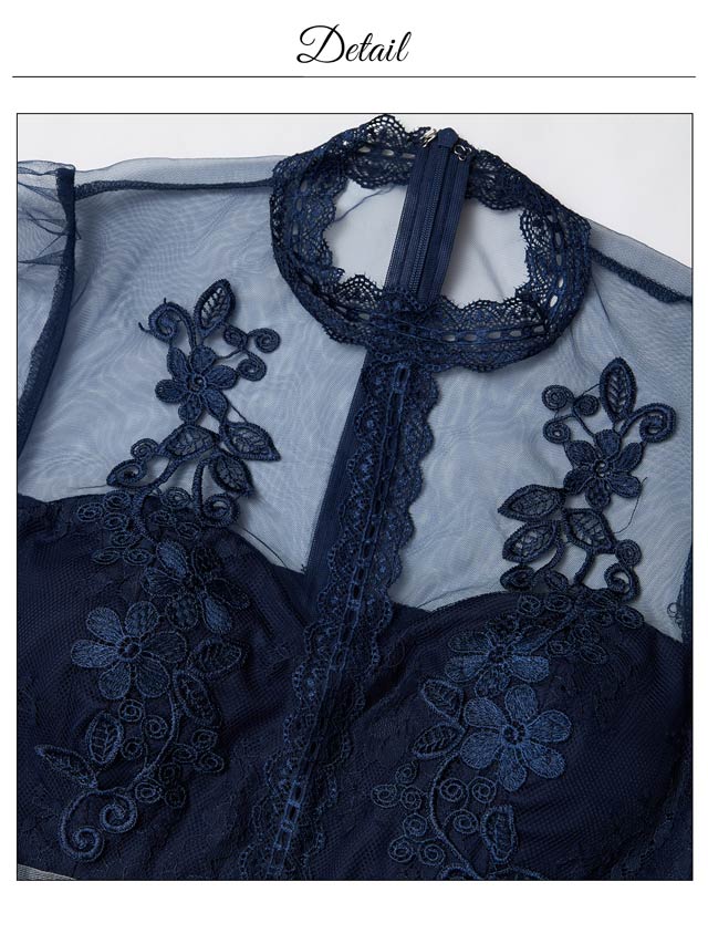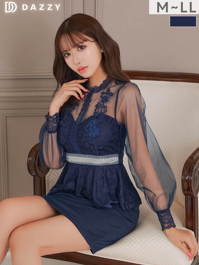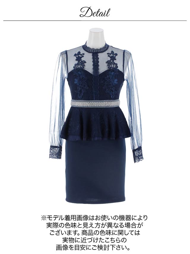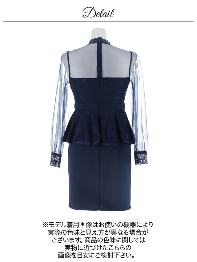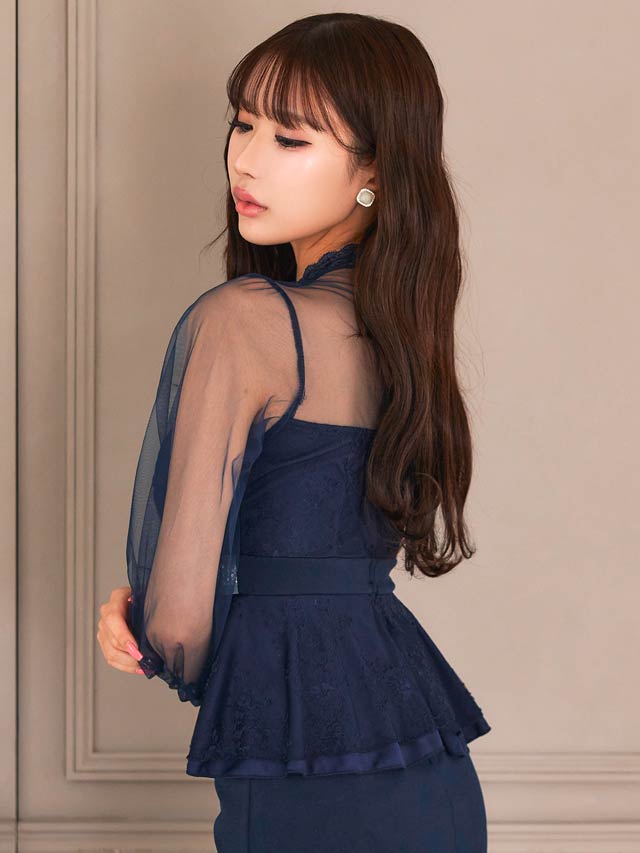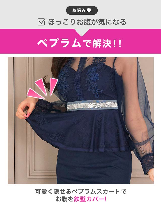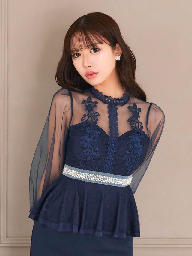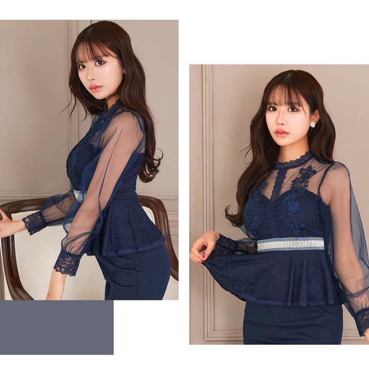 繊細なレースとシアー素材を合わせたエレガントなキャバドレス。ウエストにはパールビジューを施しキラッと輝きながらスタイルアップ効果も◎ ペプラム仕様がお腹周りをカバーしつつ、スカート部分はタイトに仕上げることでメリハリのある美シルエット叶う1着です。