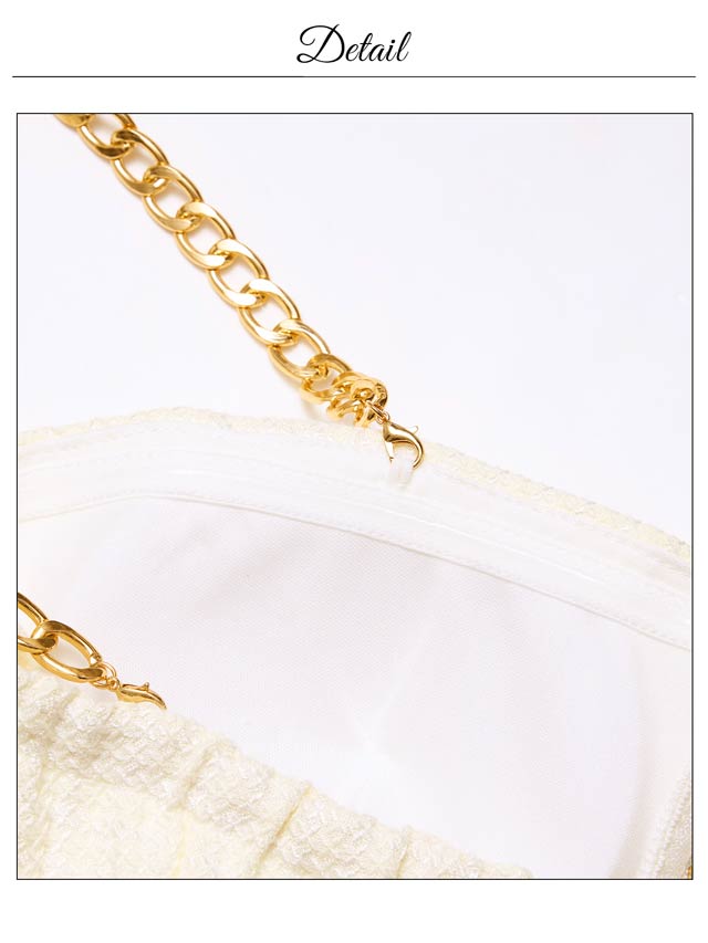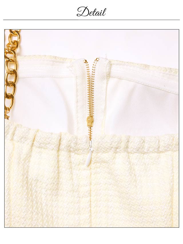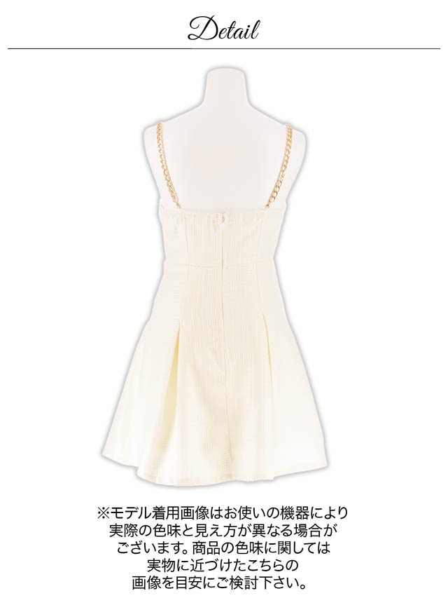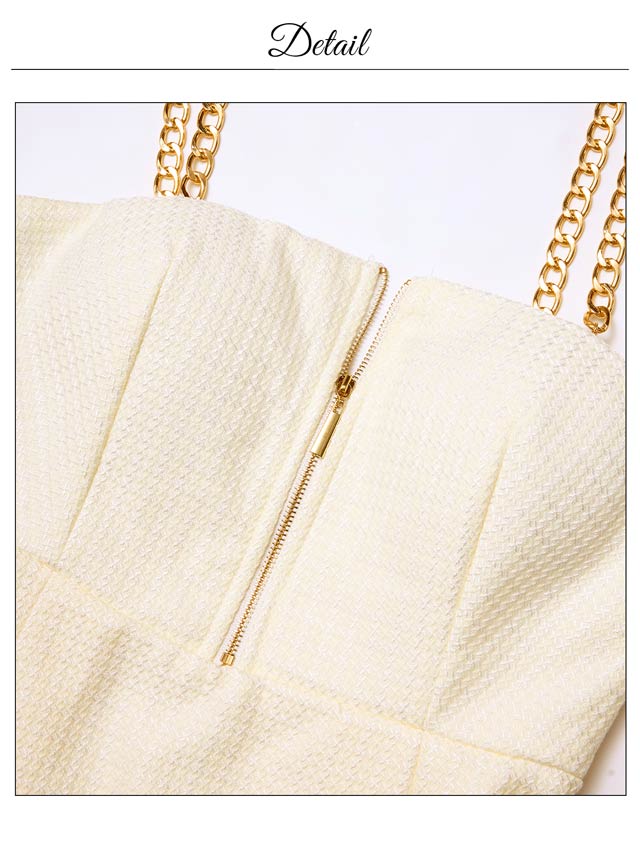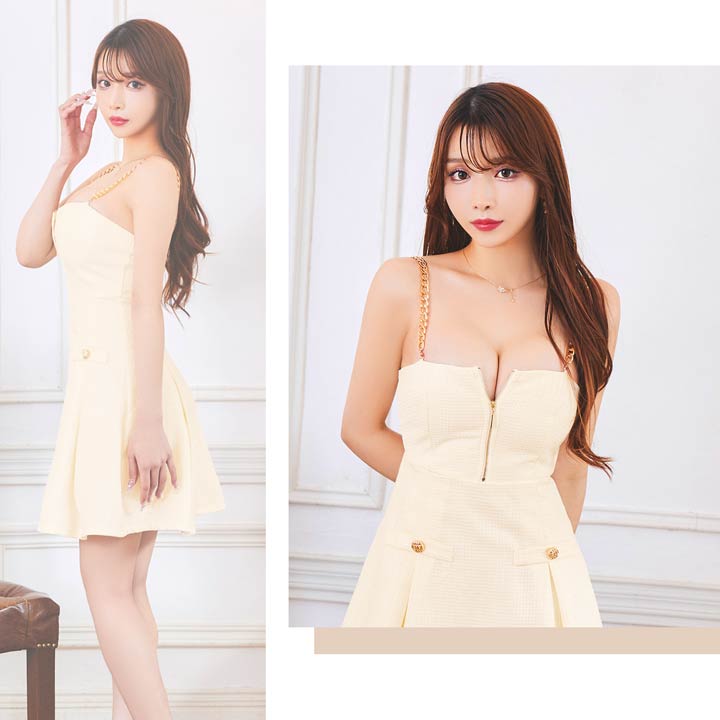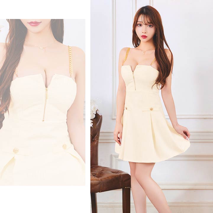 清潔感漂う淡いカラーに、肩紐のチェーンとゴールドボタンがアクセントになったキャバドレス。調節自在なフロントジップで谷間をキレイに魅せ、女性らしい色気を引き立てます◎ハイウエスト切替&Aラインスカートで、スタイルアップしながらお尻まわりのカバーも叶う一着です!