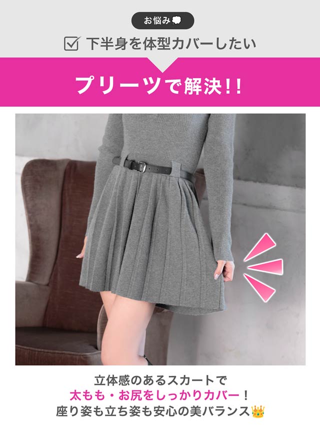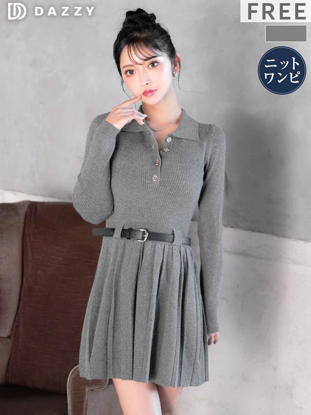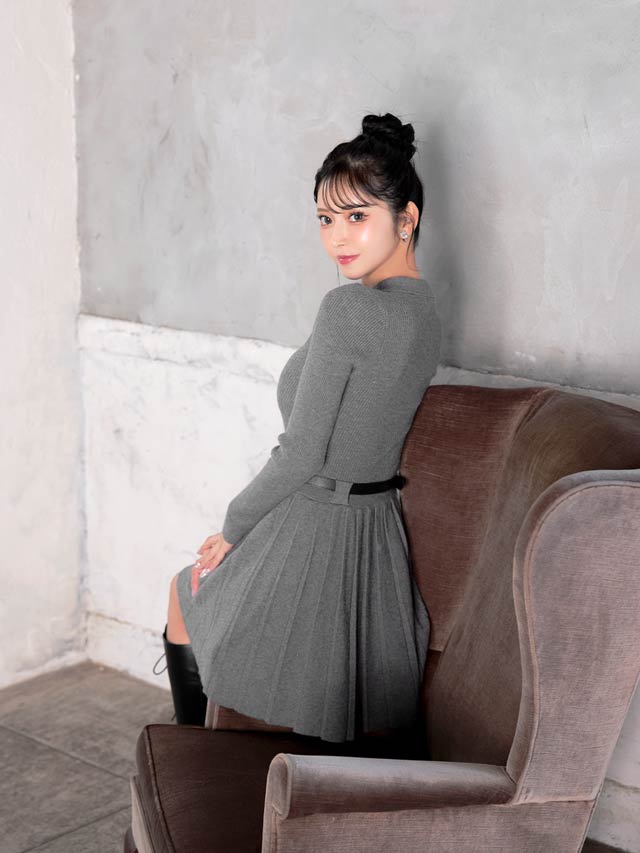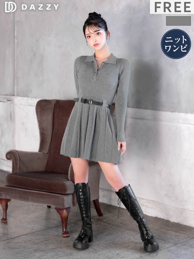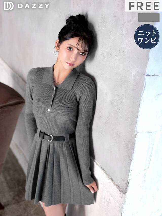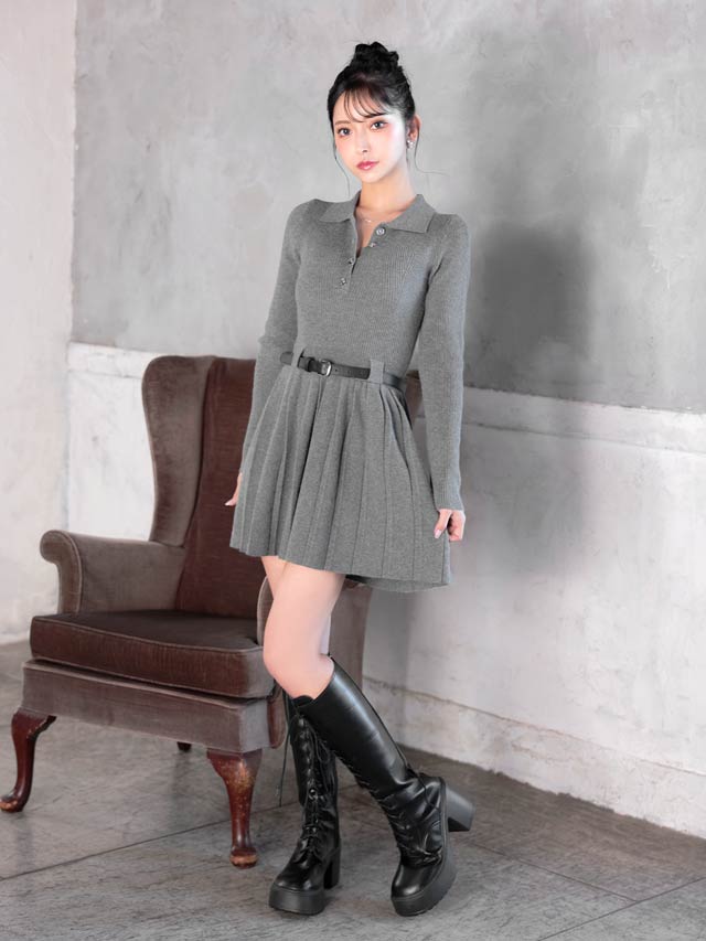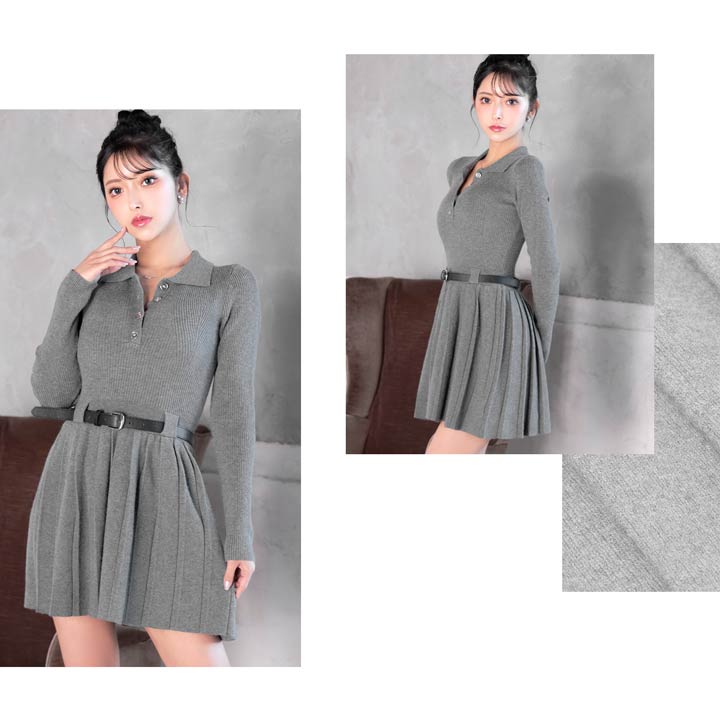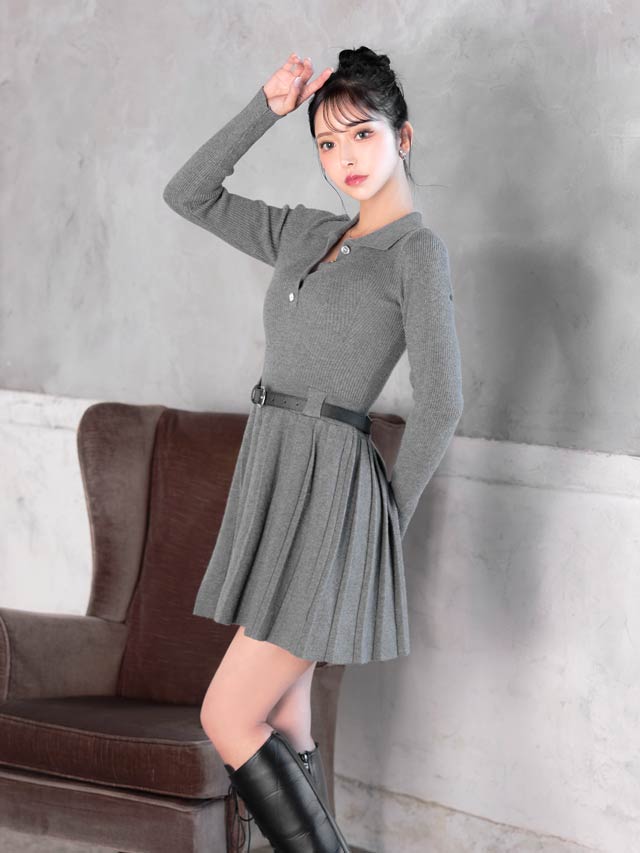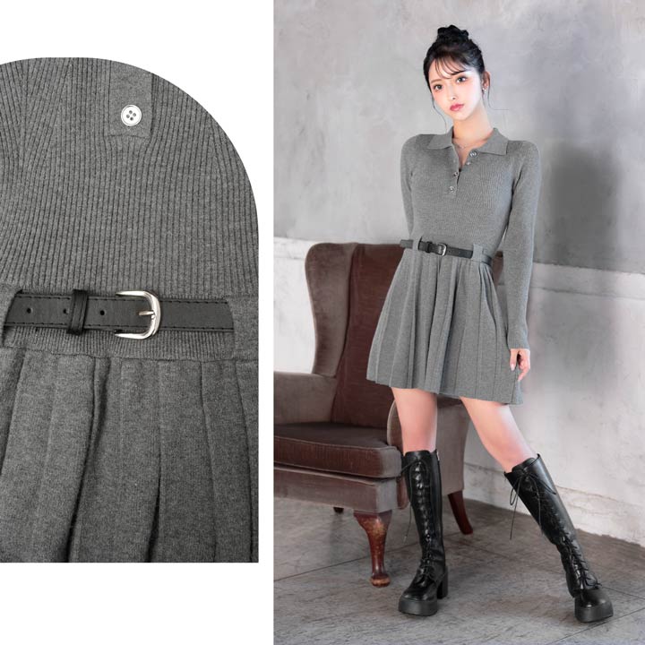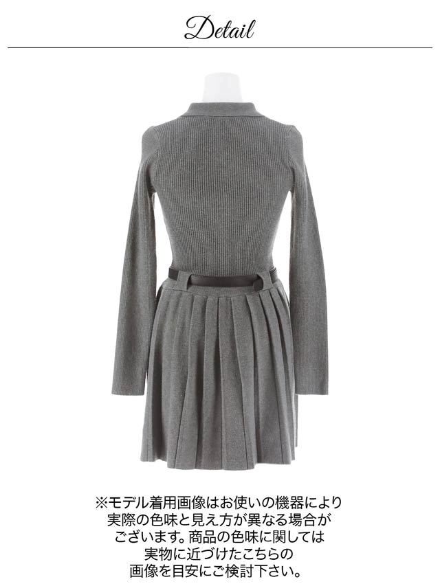 襟付きデザインできちんと感を演出するシンプルなミニ丈ニットワンピース。プリーツスカートが可愛らしさをプラスしつつ、お尻まわりをカバーしてくれるのが嬉しいポイント♪付属のベルトでウエストマークができるので脚長効果も抜群です◎