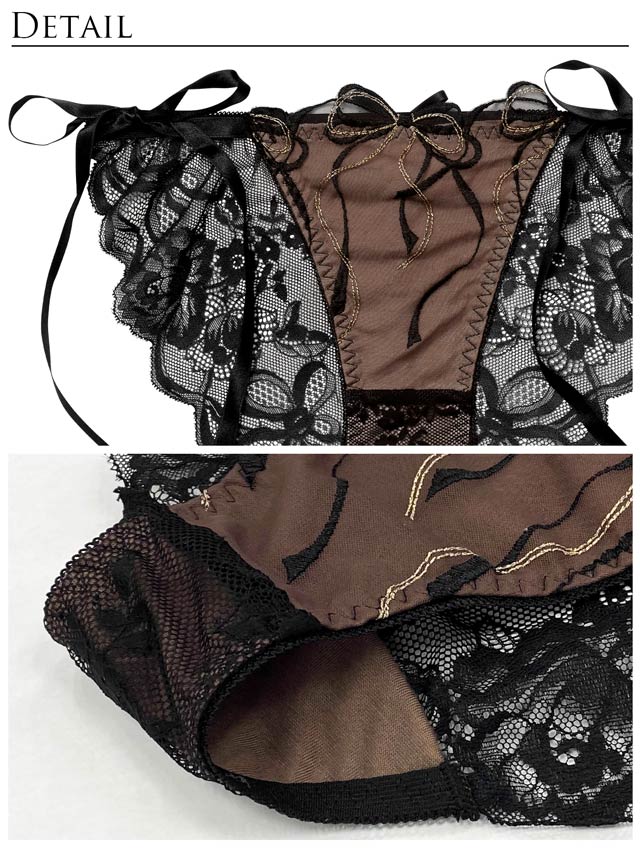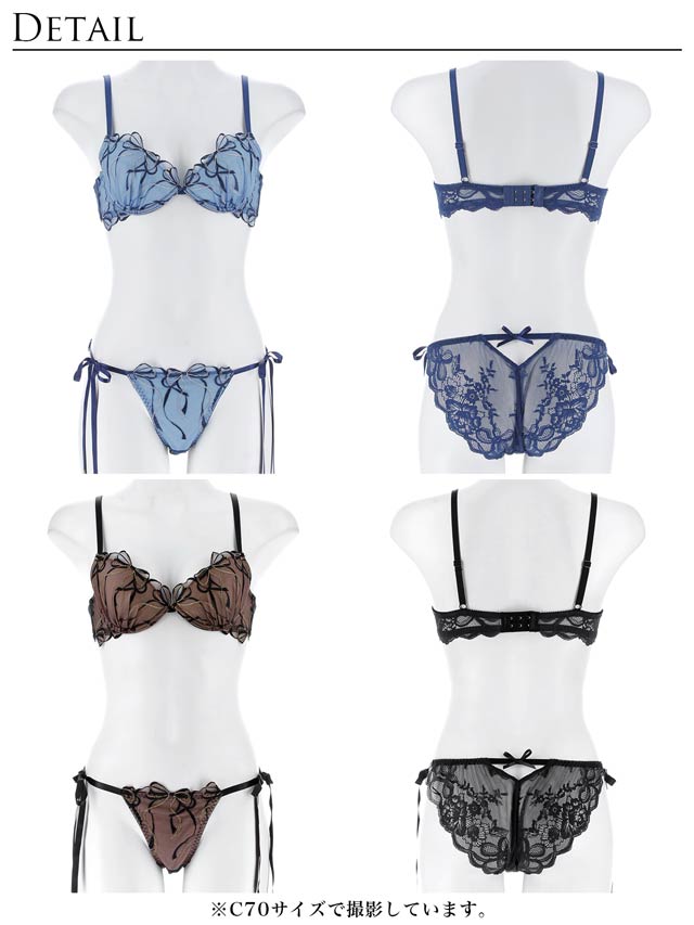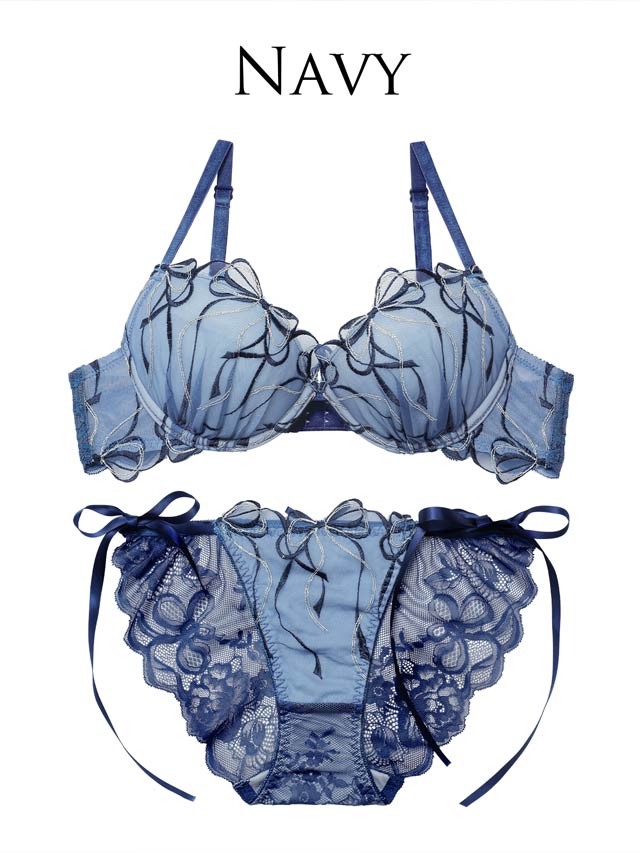 透け感のあるレースに、2色使いの可愛らしいリボン柄刺繍をあしらったランジェリー。甘さ控えめな落ち着きのあるカラーで大人っぽい雰囲気に仕上げています。ショーツサイドは手結びのサテンリボン仕様。思わずほどきたくなるほんのりセクシーなデザインです。